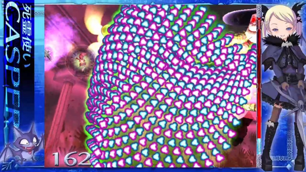 From this day forward I’ll struggle to ever pack a weapon that isn’t called Haunt Scissors but whether they’re named or not, as always with these things, it’s definitely worth getting to know each of the four characters, as well as their familiars, providing alternate secondary fire around you, and seeing which fits your play-style but for context, my impression is that Windia and Casper are reasonably balanced, Supe is high-powered but doesn’t generate a huge amount of pick-ups for score or extra power from dead enemies, and Lei is the opposite, with less firepower but wringing every last ounce of goodies out of every last enemy, if you want to hit the high score table hard! I’ll come back to scoring (as far as I can!) in a sec but let’s quickly run through how to play, and it’s pretty much classic Cave, where tapping fire gives you a regular shot and maintains your movement speed, while holding it down gives you continuous, focussed fire but also slows you down, which is anything but a disadvantage in a lot of bullet-heavy situations you’ll encounter here later! In the original Deathsmiles, tapping fire was, however, the only way to get certain enemies to spawn certain bonus items and I’m not sure that’s the case here but don’t quote me on that – while I’ve now finished it many times over, and in a reasonable number of credits, I’ve honestly never got into its more advanced mechanics like I did the first game but all the same, I haven’t really noticed it here either.