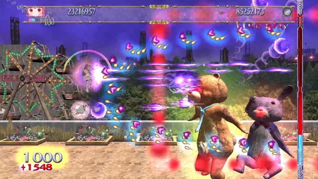 I’m not going to go wild on these but somewhere along the line (I assume in 2010 for the Xbox 360 release) there was clearly significant effort put into both beefing up the original experience and giving it a bit more polish too. I’ll start with X Mode, which is pretty much a full remaster, with an enhanced widescreen presentation and a lot of improvements to the visuals, although there’s only so much you can do with those grabbing hands (aside from adding more of them). Heavy Snake is looking heavier though! There’s also some really stunning lighting effects making for some striking reflections too – the marble floors in the palatial Haunted Ruins area really jump out now in this regard! We’ve also got two new levels, the first of which, The Maze, is mandatory, introducing some weird jellyfish enemies among others, as well as a new spider boss, which might have my favourite bullet patterns in the game, although the rest seems like what was left on the cutting room floor from the City of Despair level. Then there’s an optional pre-final level, Lost Paradise, which is like an industrial theme park dressed for Christmas, with giant circus elephant enemies, and a pair of not-very-cuddly toys for bosses. And that’s quite the challenge, especially if you ramp up the reinstated selectable difficulties for each level, although the lower ones are a really nice way of learning the game and probably taking your first steps into the genre too. Rosa and Follett have also been reinstated as playable characters, and there’s new (Japanese ) voice-acting in some of the cutscenes, most of which are now skippable, and there are new full-motion pre-boss introduction scenes too. Powering up has also been modified, I think with the intention of making it more fluid during gameplay, but I’m not so keen – seems less intuitive to me now… Maybe I just need to spend time in the new training option inside this one too though!
