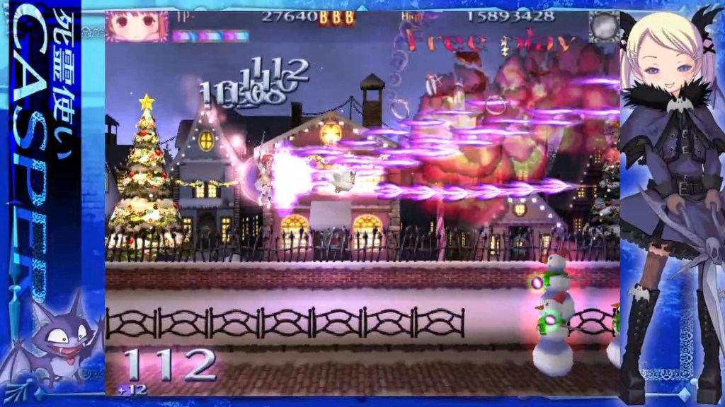 Its 2009 arcade sequel, Deathsmiles II: Makai No Merry Christmas, on the other hand, realistically won’t be anywhere close! However, should I ever decide to do a top ten favourite Christmas games… I’ll let you into a secret – I just liked that idea so much I’ve scheduled a placeholder for December 2025! Anyway, before I get any more sidetracked and embark upon that instead because there’s no way I can wait a year to put that list together, let’s get into Deathsmiles II which, despite the lukewarm welcome I’ve just given it, is still a shoot ‘em up by Cave, and it’s still a very good one; it’s just a bit different! By my reckoning, the English version of the original Japanese title, Deathsmiles II: Makai no Merry Christmas, turned back into Japanese characters then translated into actual English ends up as something like “Deathsmiles II: Merry Christmas in the Demon World.” However, the game’s own website further translates it to “Merry Christmas in Hell,” which makes me wonder if “Merry Christmas From Hell” was maybe the intention? Whatever, any of the above place us about two months on from the Halloween setting of the first game, as the magical world of Gilverado casts aside any lingering memories of any recent occult invasions and gets ready for Christmas, and we meet Windia, one of the returning “Angels” from the first game, on her way home through an idyllically festive, modern-Dickensian shopping street in the city, where she spots a freezing-cold little girl trying to warm herself on a tiny flame in an alleyway. She decides to take her home with her, and the next thing we know they’re back in the luxurious Dior Mansion, where Count (or Grandpa) Dior, who has devoted himself to taking care of Gilverado’s lost children, is lying in a pool of blood, with the now thawed-out little girl crying at his side and the rest of his Angels gathered around.
