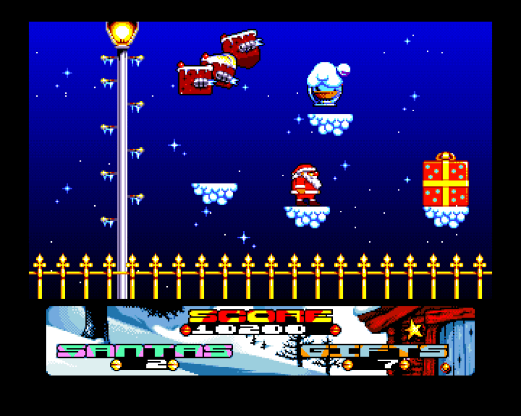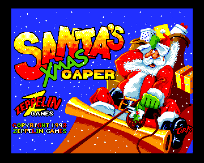 This time last year, we looked at the Commodore 64 version of Santa’s Xmas Caper, a brutally difficult horizontally scrolling shoot ‘em up by Zeppelin Games in 1990. Two years later they made a game of the same name but this time it’s a Christmas-themed platformer instead; in fact, apart from the loading screen, the only thing they have in common is that difficulty! Actually, this doesn’t hate you quite as much. It’s just a bit unforgiving! Simple setup though – you’re playing a particularly clumsy Santa, who’s dropped all his presents all over seven festive to the extreme levels, to the point you’ll be jumping across bits of a turkey in one of them… Some of the tastiest-looking Christmas puddings you’ll ever see in a game on that one too! Then there’s giant Christmas crackers to get around, and wintry landscapes, and Dickensian rooftops and so on too, all to another mix of mildly irritating but well constructed Christmas tunes. Once again, you’ve got a typically floaty jump on your side, and with that you need to leap around these levels and retrieve the specified number of presents you’ve lost before moving to the next. You can chuck snowballs to temporarily halt the meanies in your way too, although they’re the least of your worries with all the leaps of faith onto moving platforms you’ll be doing! It’s a lot of fun though, and the levels might be fiendish but exploring every inch to find that last missing present is very rewarding. Really colourful, console-like graphics too, and there can’t be many more appropriate games to close this Christmas Special with!