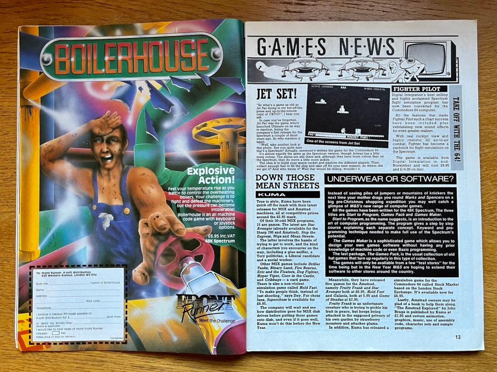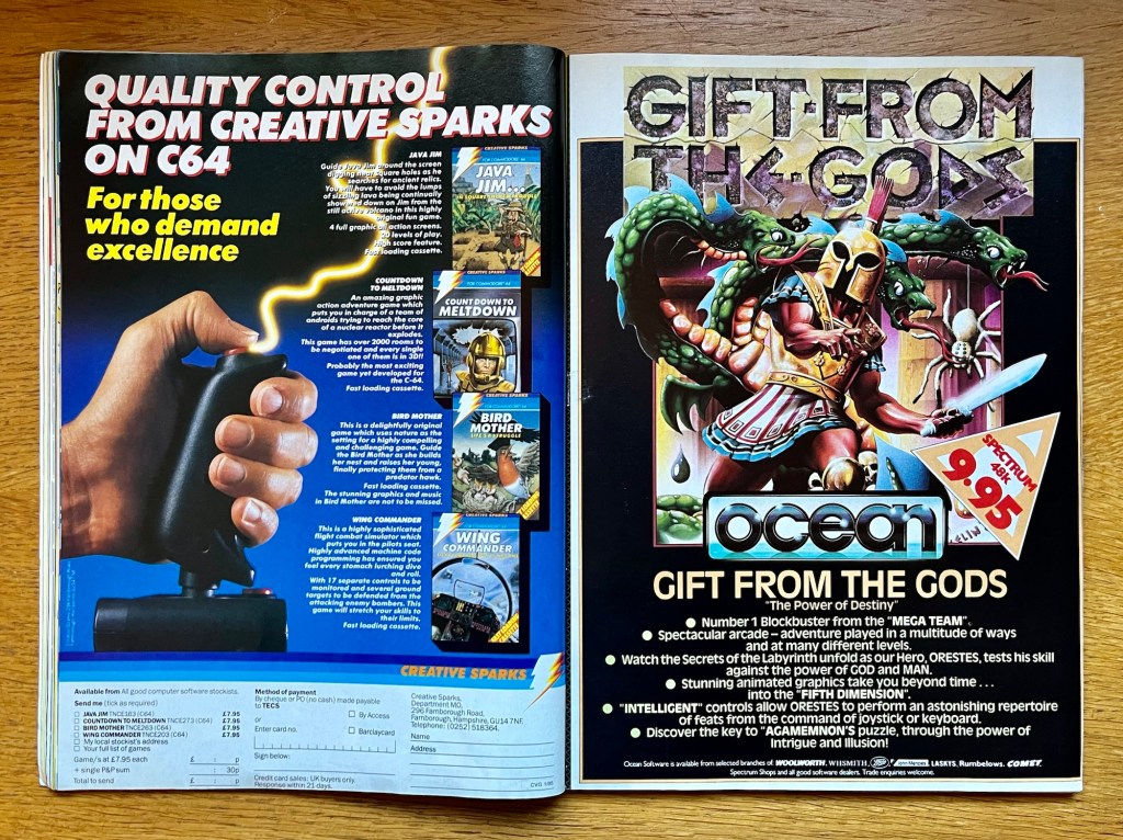 When I started doing these with a handful of issues from 1983, apart from a few early giants like Ultimate and Ocean further staking their claims, there was very little colour to be found anywhere, and adverts for games were mainly single-page, multiple title ones, or just massive lists of them from stockists. Fast-forward to 1985 and it’s the total opposite, with all the colours the mid-eighties had to throw at you, and across double-pages too, which is also why we’ll increasingly be finding missing pages for everything that ended up on my bedroom wall! All the same, there’s not a whole lot of note that’s new to us this month… One of the most unforgiving games of all time, Airwolf, makes its first appearance, added to the regular Elite ad with the terrible air-brushed versions of The Dukes of Hazzard and Lee Majors in Fall Guy (see my Super Stunt Man deep-dive for more on him)! Actually, that’s followed by equally dreadful adverts for Cliff Hanger and Shoot the Rapids, sharing a double-page composite photo of a cowboy holding a gun to a canoeist’s head, or for some really bad air-brushing, you’ve already seen the Boilerhouse advert back up the page! There’s a couple of Christmas games too, with Merry Christmas Santa and the Very Wally Christmas Automania and Pyjamarama twin-pack, and we’ve got Boulder Dash appearing on the Spectrum in time for Christmas too. And Gift From The Gods, which I think is the first of these that would end up blu-tacked to my wall in the not too distant future!