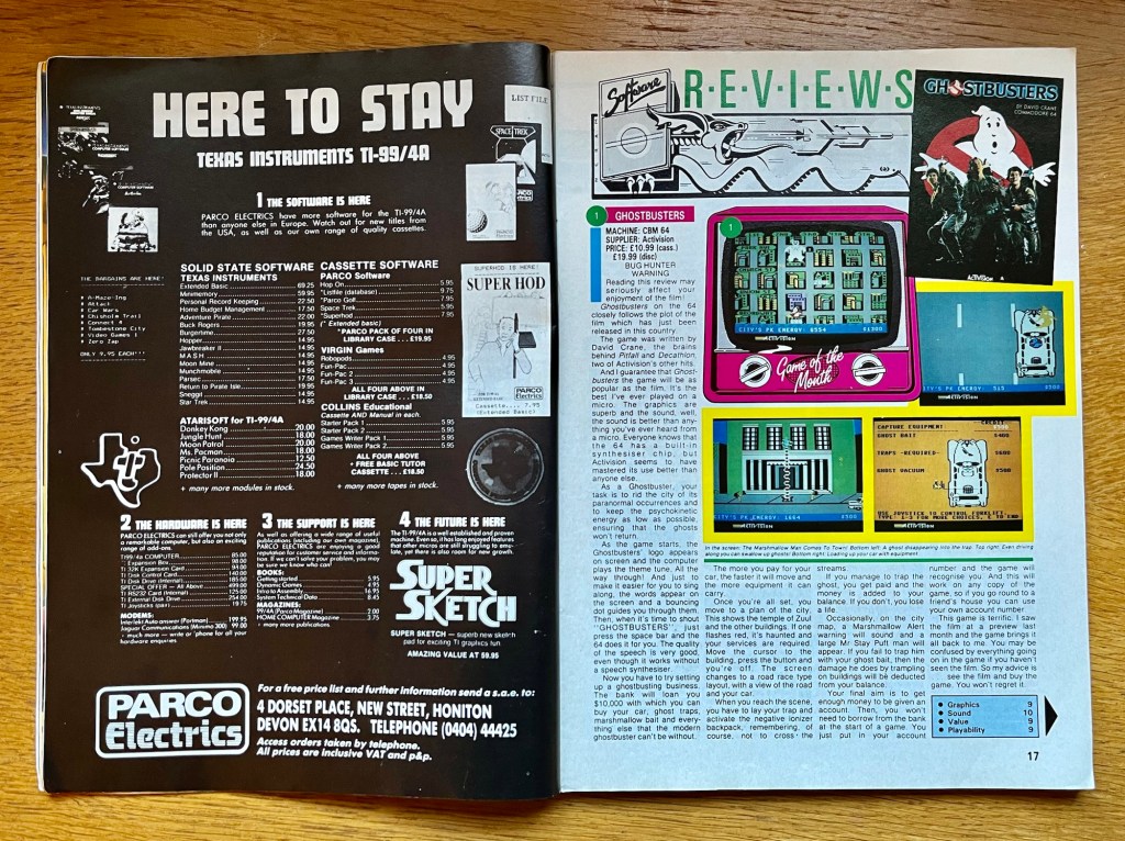 There were a ton of reviews in the last issue, which would reflect getting the bulk of games onto the shelves in plenty of time for Christmas, but this month it’s certainly a case of quality over quantity because the three games book-ending what’s here are not only all-time classics but include some really big ones; in fact, looking at them today, it’s staggering to think they appeared all at once! We’ll start with another movie tie-in, and what in my humble opinion is narrowly pipped only by Atari’s Star Wars as the best ever, and that’s Ghostbusters by Activision on the Commodore 64! It follows the film’s plot closely enough but has you running your own Ghostbusters franchise instead, with all the gear you need to keep Zuul at bay funded by a bank loan, then you’re patrolling the city, catching ghosts, getting slimed, and eventually going face-to-face with Marshmallow Man (or the bank manager). It scored nines for graphics, value and playability, and a perfect ten for sound, which that legendary karaoke-style rendition of the theme tune on the title screen deserves all by itself! However much Texas Instruments is proclaiming “here to stay” on its dreadfully boring advert across the page from that review, the last few issues I’ve read have seen both the dominance of the Spectrum and the establishment of the C64 as its main rival, all at the expense of pretty much every other platform, but there’s a bit of a resurgence elsewhere this month, as well as the emergence of that weird Amstrad thing! We’ll go there next, where it’s now got its own port of the brilliantly addictive Football Manager, not that you’d know it from the review, which makes it sound like the accounting simulator it probably is in reality, as well as Star Avenger, which is a decent Scramble clone because every machine has to have at least one but ideally a dozen!