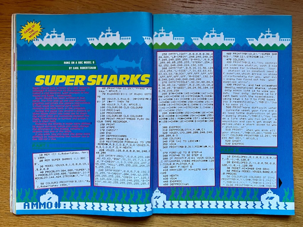 Worth mentioning that consoles have, for the time being at least, now completely disappeared from C&VG. Not a trace this month! Arcade Action is next though, and reporting on a few highlights from a recent trade-only arcade games show in London, which honestly can’t have been great if this is the best they’ve got, which is not to demean Konami’s Mikie in any way because I’m a huge fan of this oddball kiss ‘em up’s ZX Spectrum conversion! It’s not exactly an arcade classic though, and likewise Future Spy, which is more or less Zaxxon, or the third game covered, Super Don Quix-Ote, a laser disc game along the lines of Dragon’s Lair… Actually, it is just a poor man’s Dragon’s Lair as far as I can tell! There will be occasions in the coming months and years that I’ll be gushing over this section, just like I did at the time, but unfortunately this really isn’t one of them! Some decent games listings to type in yourself though, and they start now with Super Sharks on the BBC, which is a beast of a program and a decent one by the looks of it too, unusually for one of these things getting a full double-page screenshot behind the opening code, showing a kind of reverse Missile Command meets Space Invaders with a very impressive shark sprite! Several pages of BASIC later, we get to 64 Synth, a surprisingly fully-featured musical synthesiser program for the C64, while the less-cultured Spectrum owner gets to run around a post office looking for letters once they’re done with the massive listing for Post Mania, which, joking aside, seems to be another really sophisticated game for a type-in, with what could easily pass as commercial-grade graphics from what I’ve seen of it! I’ve done more than see this last game though – I actually typed it in when I originally borrowed this copy of the magazine from my friend for the weekend, which was generally how I’d been reading it for a year or so, although that was about to change…