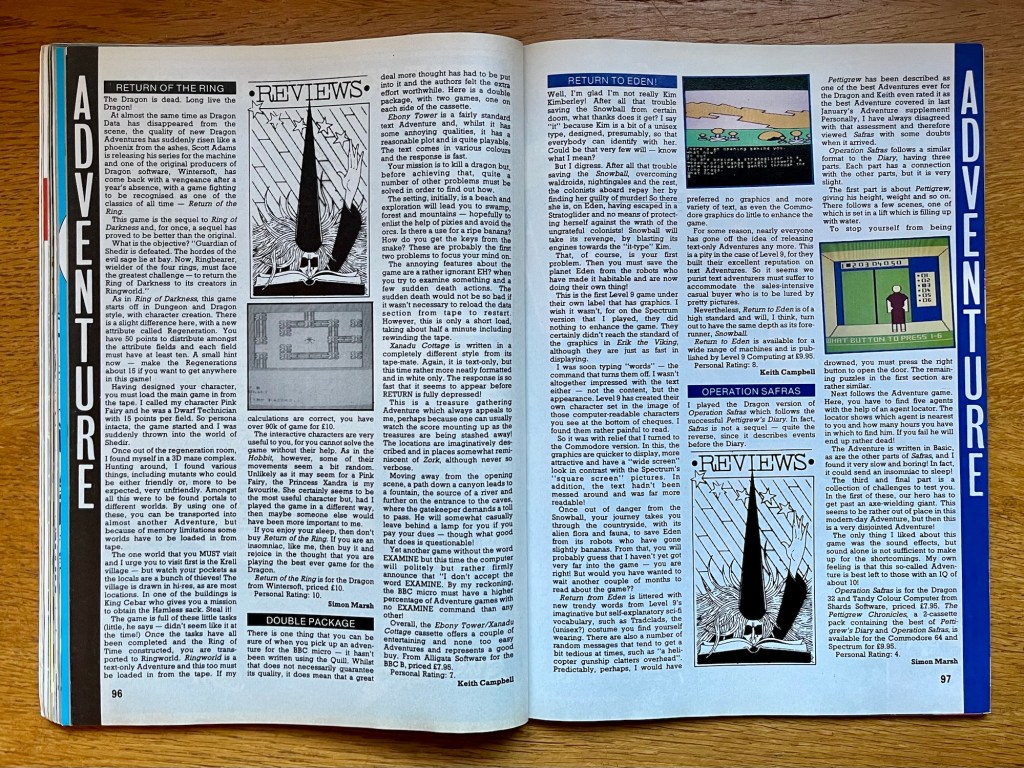 I’ve said it before but even though I’d pore over every other word in these magazines, over and over again until the next issue arrived, I used to find the Adventure section so boring, and generally just skipped past it! That’s a bit more difficult this month though because it’s one of those enormous Adventure Extra specials, so despite saying we’d only just hit the middle pages just now, I’m not sure how much of the rest I can face in reality, so we might be onto adverts and then out of here sooner than you might have thought! There’s just so much text here, and so many games no one has ever cared about, and the authors are just so annoyingly into it, and then there’s that stupid recurring sketch of what I assume is one of these nerds dressed as a wizard… I suppose we should be thankful for the coming of the graphical text adventure though, even if examples like Return to Eden on the BBC here are hardly festive feasts for the eye. Aside from a million adverts, the rest of this “special” mostly consists of a tabletop, pencil and dice version of Doomdark’s Revenge, which is actually pretty cool and a nice Christmas bonus for us fantasy role-playing weirdos, but for everyone else, probably best to focus on those adverts instead!