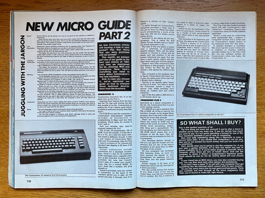 As said, we’ve got all the usual suspects too – huge ads for Manic Miner and Jet Set Willy, Knight Lore and Underworlde, then there’s the likes of Ghostbusters and F-15 Strike Eagle, Bruce Lee and Match Day we’ve seen previously, and all the obscurities like Frenzy and Frak, where the big, full-colour, custom-illustrated adverts probably cost more than the game ever made back. Which makes me sad, so maybe I’ll give them a go in a future Weekly Spotlight too! Right, let’s close by mopping up any other features we’ve missed, and the one that jumped out at me was part two of the New Micro Guide from last month, where we learned all about the exciting new Amstrad, MSX, QL and Enterprise computers that would be setting the world alight in 1985! This time it’s the turn of the new Commodore machines, the Commodore 16 and the Commodore Plus 4. The C16 was like a sequel to the VIC-20, and I’d have loved one at the time for all the games like Paperboy and Yie Ar Kung-Fu that just about made it onto there, where the VIC had had no chance… But obviously I’d have like a C64 even more! And the Plus 4 is just an oddity – like a more serious but more rubbish C64 designed to compete with the Sinclair QL, as if anyone needed to worry about competing with that. Could run C16 software too though, so if you were worried about missing out on Rolf Harris Picture Builder on there then worry no more! Not for the first time, we’ve run long here, so I think that bombshell is going to do us for this time, but do join me again as soon as February 1985 comes around for more of the same! In the meantime, I’ll leave you with a sage piece of advice from this buyer’s guide article… “If your friend has an MSX micro, you may also consider buying one. You can lend each other games and peripherals.” And don’t you forget it! See you next time!