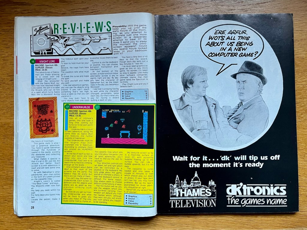 The BBC is doing alright this month too, with what sounds suspiciously like another clone, Mr EE, the highest scoring of a bunch of new releases, with you tunnelling to collect fruit while being chased around underground… Even the poor old VIC-20 got a rare look in again, with the excellent (and insanely frantic) horizontal shooter, Dodo’s Lair, giving me something to look forward to for Christmas on the latter after all! As if Ghostbusters wasn’t enough, the C64 finally has what was a brilliant version of the sequel to David Crane’s other game, Pitfall, and a couple of board games in time for Christmas too, including the little-known strategy game Kensington, which looks to be little-known for good reason, and the much more exciting Cluedo, and that translates really well, albeit in a no frills kind of way that probably means you’re as well sticking to the original after all! I’ve just noticed that for once – Texas Instruments aside – we’re getting some decent adverts across the page from the reviews I’m highlighting this month, although I’m not sure even Arthur Daley can wheel and deal his way around this next pair of games… We did see some very cool adverts for these last month too but now they’ve arrived for real, and in case you didn’t already know, both Knight Lore and Underworlde have lived up to expectations and then some! I should say there were a few other Spectrum games reviewed, but the likes of Star Bike, Battlecars and even the mighty Jasper just don’t register alongside such gaming royalty! “I’ve never seen graphics as good as this on any micro game” is exactly right about Knight Lore, clearly the headline act here despite deservedly similar mega-scores for both of them, but this was and is something else, and is without doubt the gold standard 3D action adventure on any 8-bit system as well as most since, and simply reading this review here seems like such a privilege today!