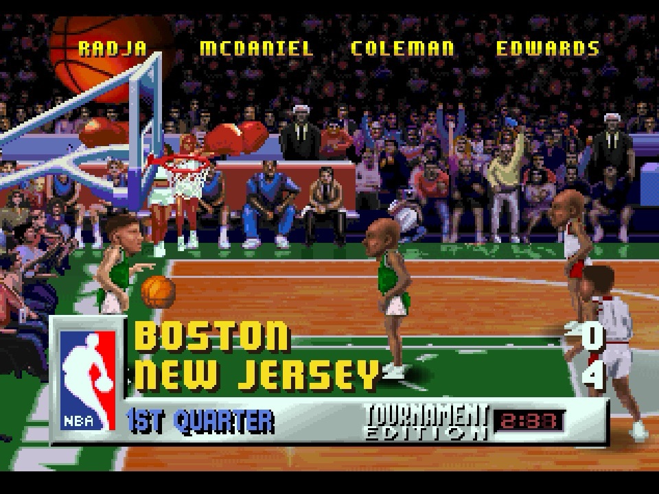 They’re the basics but things get more interesting when you start combining the three buttons. For example, when you’re running at the basket and get close enough, turbo plus shoot / block will trigger a slam-dunk attempt, and depending on your dunking ability and where you’re trying it from, you might pull-off one of the game’s spectacular trademark Ultra-Jams! Similarly, when you’re out of possession, pressing both of these will make you go for a super-block, jumping way higher than normal! Pressing turbo and pass / steal when you have the ball will add a bit of flourish to your passes, like adding a bounce or throwing from behind your back, which don’t only look fancy but are thrown harder so are often safer too. And if you press these when you don’t have the ball, it will turn you into a bit of a tank, shoving anyone in your path (including your teammate if you’re not careful) out of the way, American football-style, which can be handy if you’re trying to instigate a steal or grab a rebound, or just make a last-ditch attempt at stopping a basket, but can also be useful in giving your teammate a decent chance at the basket if he has the ball! Rubbish original controller aside, this control scheme is just genius! Every bit of nuance and depth, and every bit of fun, all there on three buttons but also on a single thumb, seamlessly able to slide back and forth and all instantly accessible to a total newcomer from the outset. While you might be pulling off impossible windmill-jams from twenty-feet in the air in no time though, making your way through all twenty-seven teams in Tournament Mode is going to take some doing, and whether you’ve got any helpers on or not, you’re not going to be walking all over the opposition any time soon; just getting a bit closer, whether that’s five points closer or fifty! It’s really well balanced either way though, and the back and forth flow to the gameplay feels about right regardless of the score, or whatever wacky stuff you’re doing on the court!