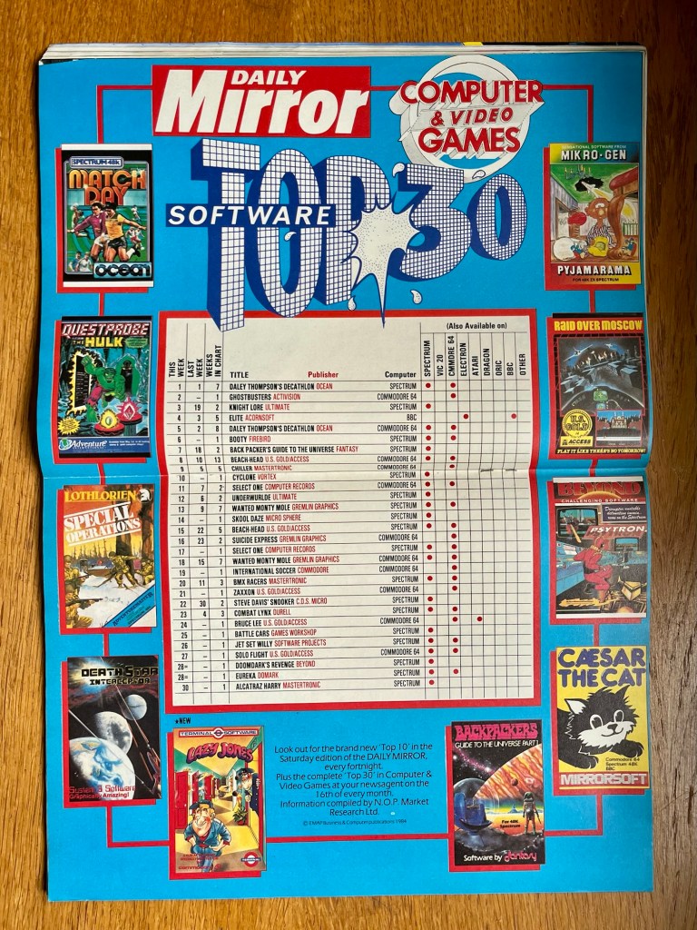 And on that topic, after stating how aware they are of the current dominance of the C64 and the Spectrum in the mag this month (and beyond), there’s also a new feature introduced, listing other stuff out on CPC, VIC-20, Atari, BBC, Electron, MSX, TI-99, Dragon and Oric, but there’s really little of either contemporary or modern day interest there, so I’m going to jump to the Top 30 Software Charts (sponsored by the Daily Mirror newspaper) instead, which, I’m afraid, does just about as much to make owners of these machines feel any better… As usual, it’s multi-format with each position taken by a single platform version of a game, which means you can see multiple games appearing twice, just like Daley Thompson’s Decathlon, once again taking the top spot on the Spectrum, with the C64 version dropping down to number five. That version of Ghostbusters is straight in at two though, with Knight Lore climbing to three and Elite on the BBC (the only game here on any other computer this month) at four. One other point of interest is the continued emergence of budget games, with the brilliant Booty by Firebird on the Spectrum appearing at six, then there’s Mastertronic following behind with Chiller, BMX Racers and Alcatraz Harry, which was the very first game I ever finished on the Spectrum! Other notable new entries include Doomdark’s Revenge and Cyclone from earlier on the Spectrum, as well as Skool Daze and Jet Set Willy back again for a bit more of the pie, while on the C64 there’s its excellent takes on Zaxxon and Bruce Lee among several others bringing it much closer to parity with the Spectrum in terms of overall representation here than ever before!