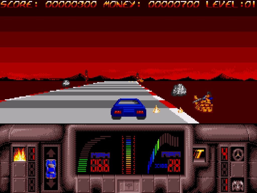 Not so long ago as I write, I was taking part in a weekly high score challenge with a bunch of long-standing online gaming friends, and that week we were playing RoadBlasters, Atari’s 1987 arcade racing game where you’re trying to get your armed-to-the-teeth sports car through fifty treacherous rally races before you run out of fuel. You can shoot enemy cars to get them to drop more of it (as well as keep racking up a very cool multipler mechanic), and sometimes a helicopter will appear with some beefier weapons to pick up, and it plays fast and loose and as much like a shooter as it does a racer… And I’ve never really liked it! After then giving it little more than a cursory go to get a score on the table, I explained it was probably a combat-racer thing rather than anything wrong with the game itself – I immediately thought about Taito’s Chase H.Q. from 1988, which I like even less, and the technical marvel and (GTA-inspiration) that is Durell’s Turbo Esprit on the ZX Spectrum in 1986. Then there’s 1993’s Rock ‘n Roll Racing on the SNES as well, which ticks even more boxes than any of those in theory should, with all that stone-cold classic heavy metal playing in the background. Top-down too, which is another thing I’m into, but it’s just never clicked no matter how hard I’ve tried (and having spent actual money on it, I really have)!