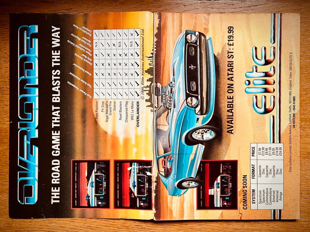 I’m not sure I ever saw this kind of thing for a game in quite so much detail before or since, but right inside the cover of the September 1988 issue of Computer & Video Games magazine, there was a huge, full-colour, oddly portrait (as shown above), double-page advert for Overlander, which featured a competitive analysis! Now, before I start pulling it apart, first I want to summarise my feelings towards the game, which are that despite the difficulty and some questionable fairness choices (mostly involving suicide cults on exploding motorbikes), I’ve always loved dipping in and out of Overlander, and I still think that initial desert environment is an absolute icon of the 16-bit era. As much as I do still enjoy it though, I wouldn’t rank it as an absolute favourite of mine… Unlike some of the games it’s comparing itself very favourably against in the little table on its big, swanky, strangely formatted C&VG advert! It’s up against Pole Position, Pit Stop, Nigel Mansell’s Grand Prix, Out Run (or “Outrun”), Road Blasters, Chequered Flag (which I assume is the Spectrum one) and WEC Le Mans (before there was a Spectrum (or any other) one). Probably a bit excessive, especially when you consider the relative age of many of these by that time, but anyway, it’s then comparing them all on seven key criteria, all of which have obviously been chosen to put a tick in every box for Overlander!