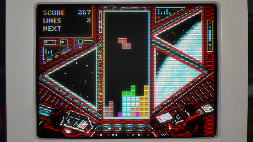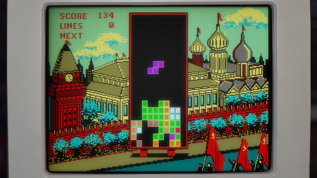 Now something I’ve been meaning to do for months to finish off with… I’ve been back to last year’s Tetris Forever compilation, which still doesn’t include the definitive Game Boy version, but among more Tetris than you can shake a stick at otherwise, it does include Spectrum Holobyte’s MS-DOS version from 1988! This is an interesting one because it’s not only the first version of the game introduced in the USA, but also follows the scoring system from Alexey Pazhitnov’s original version (also included on here), where you’re awarded points for how fast you drop your little Tetromino shapes into place, rather than for clearing lines. All the same, the more lines you clear, the faster it gets, and if you’ve picked anything above the default level of difficulty (from a total of nine), that happens pretty quickly! As well as this, you can also set the line height you want to start at, so it can chuck a load of random pieces into play from the outset (which explains the screenshot above rather than my rubbish gameplay)! Presentation is typically ancient Tetris, but the limited colour palette here makes for some very evocative backgrounds, which vary across difficulty levels, so it’s always worth stretching yourself, and altogether makes this one of the standouts in the collection.