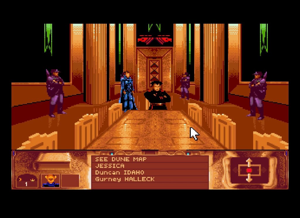 Over the past eighteen months or so, I’ve been lucky enough to have two of those Holy Grail retro-gaming moments, where you discover a new all-time favourite for the first time, and I think Dune on the Commodore Amiga is about to join Metal Gear Solid and Ico as another! This is a part point-and-click(-ish) adventure and part real-time strategy game developed by Cryo Interactive and published by Virgin in 1992, after the Dune-obsessed founder of Mastertronic (later Virgin Interactive) finally got hold of the rights and it evolved from there. When I inevitably get to a deep-dive on this I’ll fill in the huge gaps I just left! I’m going to skip the incredibly convoluted plot for now too, based on Frank Herbert’s 1965 sci-fi novel but maybe influenced more by David Lynch’s 1985 film adaptation; in fact the CD-based versions of this that followed do feature video and dialog from that. Anyway, it’s Star Wars for nerds, and you play the role of the son of the duke of one of a handful of families that run the galaxy for the big (bad?) emperor, recently arrived on the desert planet of Arrakis, or Dune, the sole source of Spice Melange, the mysterious all-powerful drug used for everything, and the real source of control in the galaxy, which you need to get at and make sure your arch-enemy family doesn’t. Oh yeah, it turns out you might also be the messiah the locals have been waiting for!
