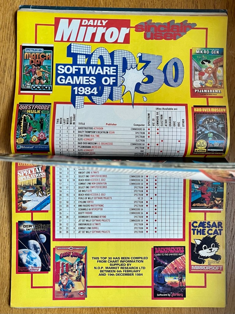 I think we’ll have a look at the Top 30 Charts next, sponsored as usual by The Daily Mirror newspaper, and spread as usual across the middle pages, although I need to apologise for the obscured picture this month – we’ll get to the bonus pull-out Book of Adventure shortly, which is what’s obscuring it because it’s never been pulled out, and I’m not going to pull it out now! Anyway, it’s also the usual countdown by game by platform, meaning you might see individual titles appearing several times on different platforms, which are listed in a grid showing where else a game is available, most of which becomes more redundant by the month as the Spectrum and C64 continue to dominate on a pretty much equal basis. That said, The Perils of Willy on the VIC-20 has made a strange reappearance this month – could just be its appearance on recent adverts for their mostly Spectrum games. And the mighty Elite is putting a circle in the box for both the BBC and the Acorn Electron, where it’s a new entry. Atari, Dragon, Oric and Others are all very noticeably empty though. Ghostbusters on the C64 is at number one this month, with Daley Thompson’s Decathlon on the Spectrum still hanging around at number two after eight weeks in the chart, and C&VG Game of the Month from earlier, 3D Starstrike, on there is in at number three. Other new and notable entries include Raid Over Moscow, Combat Lynx, Jet Set Willy and budget-classic Booty on the C64, with the latter also appearing on the Spectrum, together with Match Day, Pyjamarama, Hunchback II and Airwolf, and like I said earlier, it’s so great seeing these names that are now so familiar appearing for the first time!
