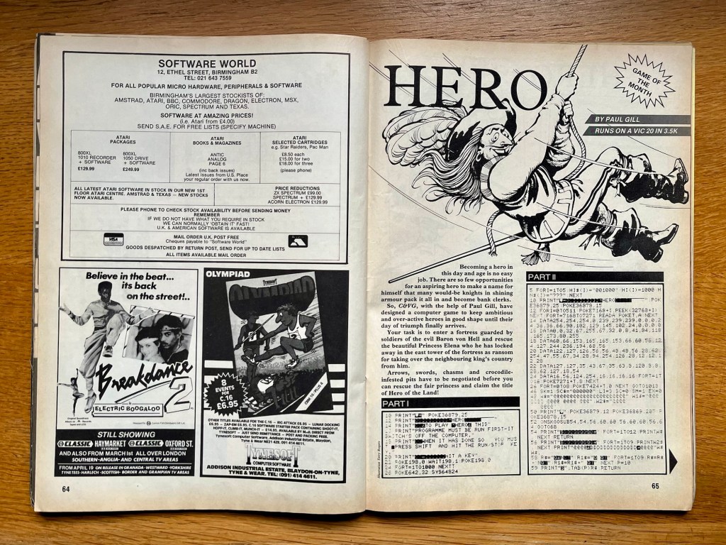 There is more (albeit not on the CPC) but I think we’ve seen the highlights, so I’ll close with some love for the BBC, which has Sim, and for the life of me I can’t work out what it is from the review but doesn’t seem worth worrying about from the vibe, as well as Labyrinth, an absolutely fantastic take on Berzerk’s maze-thing, scoring nines all the way, although the comparison with Elite at the end is pushing it a little! All the same, that’s an awful lot of very good stuff to sink your teeth into whatever system you’re lucky enough to own this month – even for us beleaguered VIC-20 owners! And we get a type-in games listing as well! Okay, it’s yet another one in the style of Hunchback, but it’s the most sophisticated of them so far, and probably the most challenging too… And on the picture above, I just noticed an advert for Breakdance 2: Electric Boogaloo across the page from it! Hard to follow that, I know, but there’s also Super Clown for the Atari home computers, where you’re dodging balloons to escape the circus tent, assuming you get the mass of DATA commands entered correctly! Meanwhile, over on the Spectrum, you’ve got a choice of Spider Fighter, a basic shooter, or Crackpot Climber, a slightly less basic platformer, but they’re both straightforward to get running which is always a bonus! Finally, there’s Bruce on the C64, which isn’t whatever you’re currently thinking a game called Bruce might be, but a kind of interpretation of Jetpac, which is also no bad thing!