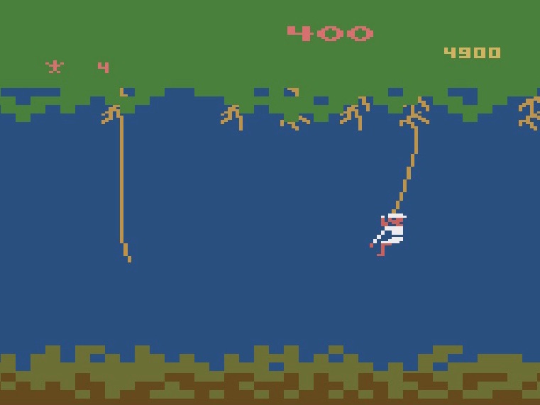 I love an ice hockey game but if you want to play on the 2600 then Ice Hockey is about all that’s on offer, although that’s fine because it’s also the only one you really need! It’s a simplified, two-on-two take on the sport, and while it seems primitive now, it was pretty groundbreaking in 1981, with the ability to switch between players and thirty-two different angles to hit the puck from, and is a really fun time on top, especially with two players. I’ve said it before but the 2600 really did have some fantastic arcade ports, and you really couldn’t expect any more of one than 1983’s Jungle Hunt. In fact, all it’s really missing is a bit of the flair of the original in the final stages, which see you first leaping between vines, swimming a crocodile-infested river, leaping over falling boulders then avoiding the local cannibals before rescuing your girlfriend from their big cooking pot! It’s so full of variety and character, and really nails the setting. A very nice showcase for the system! Two games for my set of paddle controllers next, starting with another arcade port that needs little introduction, Super Breakout from 1982. Like with its predecessor, there’s a bit more compromise to this one, as simple as bouncing a ball onto some bricks (or coloured lines) to make them disappear may be, not least that the ball is a square!