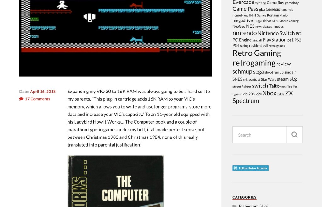 Twelve-year old me got a VIC-20 for Christmas 1984… I think… My original Perils of Willy piece actually said 1983 but based on what I’ve dug up since, as well as researching other games like Arcadia on there I’ve covered since, I think it was actually 1984 after all! Whenever, it was the best present ever! For the next few years, it was my entire life too, even during those painful times later on when the new games had long-since dried-up, the old ones were gone from the shelves, and I was living off the occasional type-in games listings you’d still get in C&VG when they were still trying to get us desperate owners of old relics like mine and the Dragon 32 and the Oric to keep buying their magazine, even though they were only really interested in the Spectrum and the C64 by then… Just like my best friend, who’d previously got a VIC-20 the same Christmas as me! As much as I loved it though, even during those first couple of glory years, it soon became apparent that the plain old 3K RAM model wasn’t going to cut it for long, and never more so than when that friend got a copy of The Perils of Willy for his birthday a few months later! Obviously, he got the exotic 16K RAM expansion you needed to run it too, and if ever there was an advert for that nondescript thing that plugged into the back of the computer to make it future-proof, then this game was it! I adored it from the first time he loaded it up, and while it would take until the next Christmas for me to convince my parents I also needed this anonymous little grey box of memory that cost the same as a Walkman (or at least a knock-off one!) and they didn’t understand in the slightest, I got there in the end, and I also got my own copy of what to this day is not only still my favourite VIC-20 game but also a top twenty-five favourite game on any platform ever!