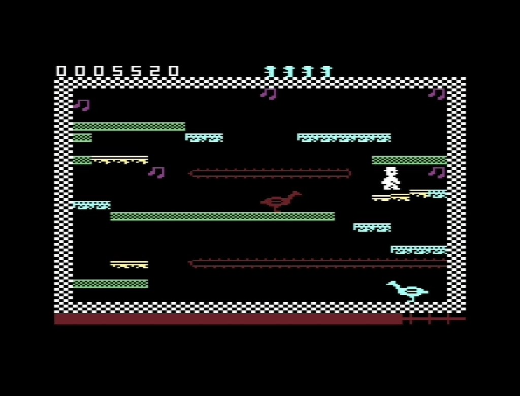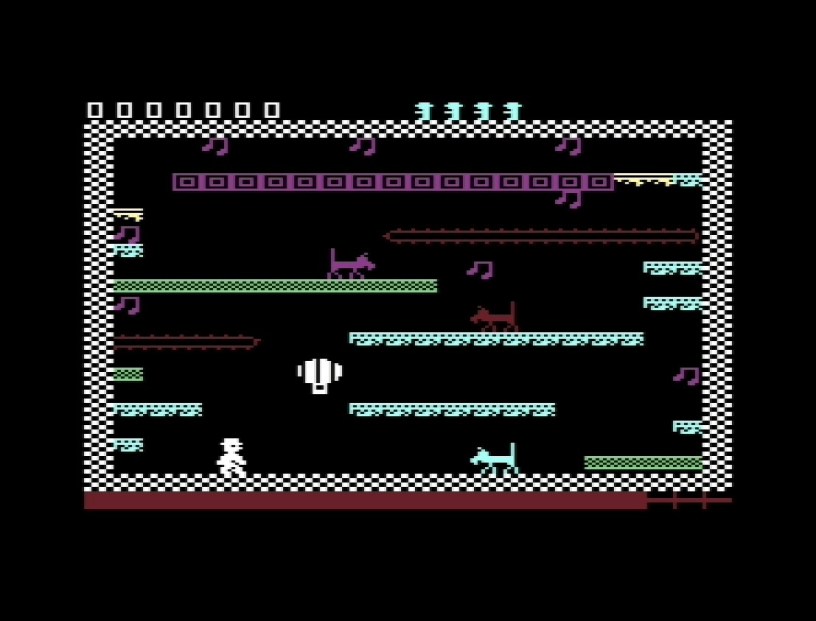Of course, painfully logically positioned platforms are one thing but they’re no fun until you throw in wild dogs, wild ducks and, er, hot air balloons floating up and down in the middle of the night to hinder your progress! Obviously, the slightest touch from any of them is one of your five lives gone, and as well as the wildlife and air-filled aircraft, later on you’ve also got trains, and every one has its own slight variance to keep you (and the necessarily very responsive controls) honest. For example, the duck (which I’m sure is actually a goose) moving its head up and down to impede your takeoff, or likewise the dogs’ wagging tails as you land. The screen really starts to fill up with them too once you’re a few screens in, while platforms get shorter (unless they’re the crumbling ones) but more dense, just like the packs of wild beasts they’re supporting, demanding both timing and precision and just a bit of luck, just like a real Miner Willy game should! Some real leaps of faith on a couple of them too, with musical notes suspended way above big drops, and if you’re dropping any more than about twice your height then that’s another life lost. And although you’ll definitely be experimenting with navigation for a very long time on some of these, while also trying to perfect the preceding screens because you’ll soon need to get all the way back to them first too, there’s only so many times you can come into even the briefest contact with a crumbling platform before it’s not there anymore, meaning a painful wait for the timer to expire so you can expire too and try again. And again!