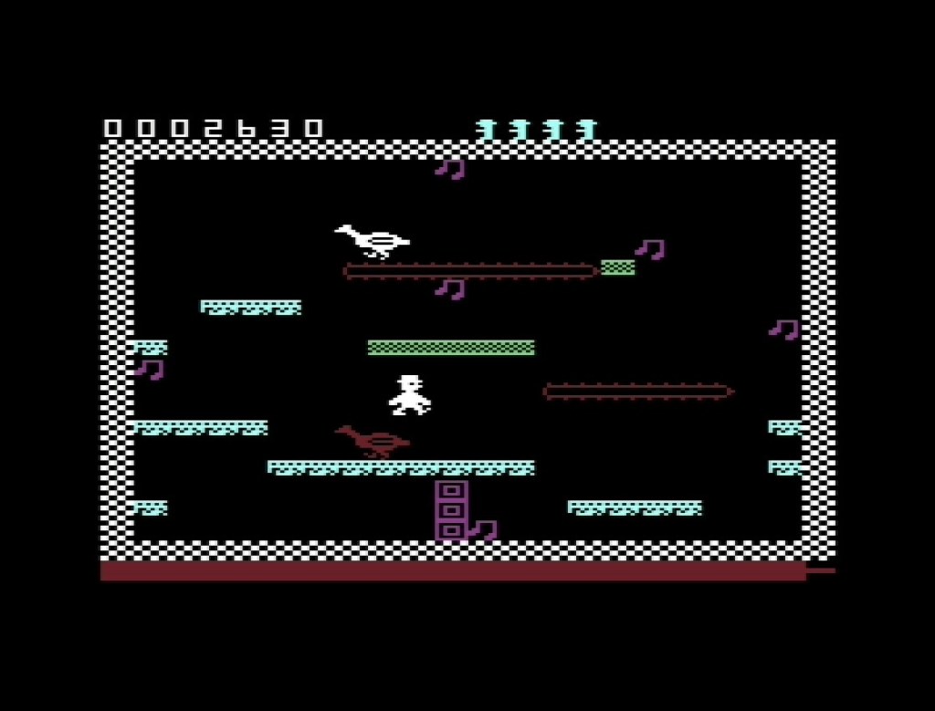 Once you’re in the swing of jumping, and the demands of the collision detection, and one of rock music’s greatest anthems being totally ruined though, the first screen isn’t so bad… As long as you don’t hang around because I forgot to mention the timer counting down on each one! Anyway, the general flow is working out the optimal route to each of the musical notes on the screen you need to collect to get your bonus for time remaining then move on to the next. It’s a similar setup to Willy’s previous adventures, but more abstract this time, in part because none of the screens have a name here, and it’s amazing how much personality such a simple thing can inject into a game when you notice it’s absent – would you know Manic Miner’s Central Cavern is a central cavern if it didn’t say so? It works though, and I’ll come back to this later! It’s also partly down to the necessary reliance on textures on the platforms to give them variety rather than mixing things up with wild colours – like on its bigger sibling, muted is the order of the day on this system, although thankfully it’s a bit more easy on the browns than the C64! But while it’s not so in your face, the platform placement is superb, combining regular horizontal structures, moving conveyor belt things (yes, in a park), and crumbling walkways into proper puzzles as you try to traverse each screen. By the way, those crumbling walkways will never cease to be a marvel to me wherever I still come across them, just like they were forty years ago right here!