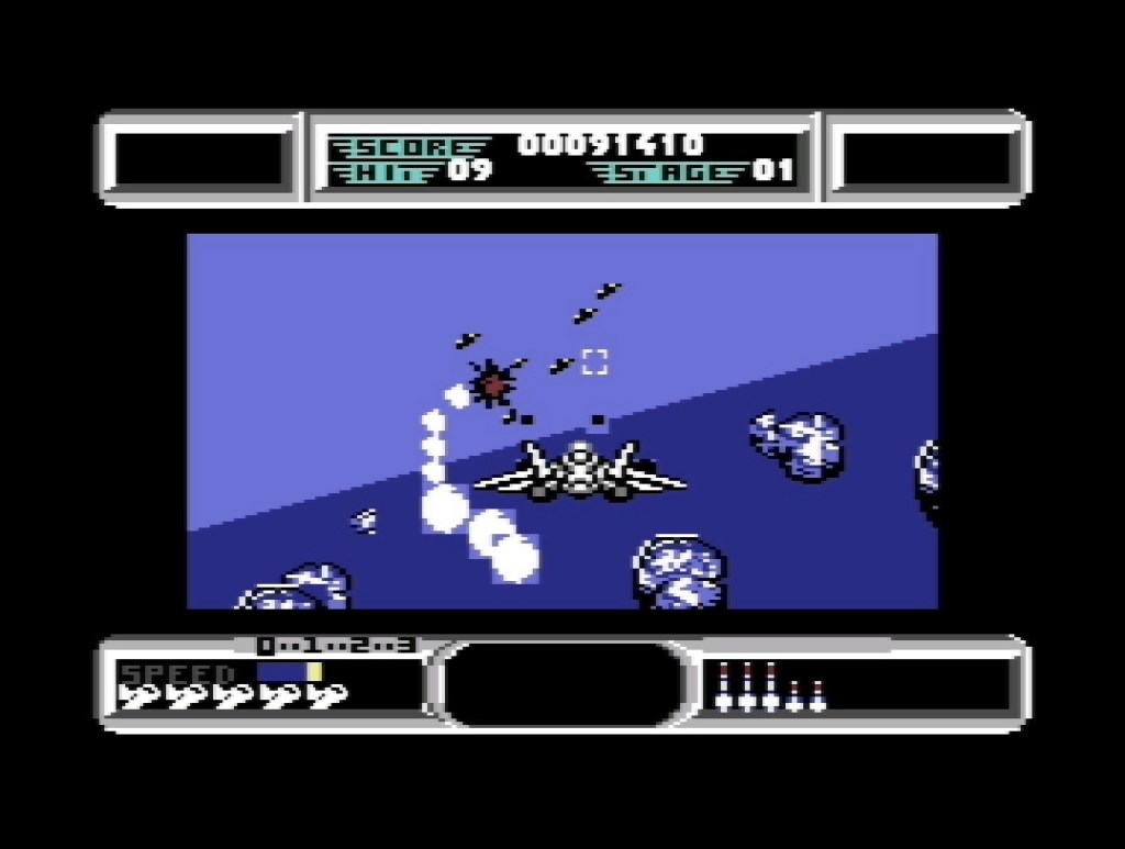 Depending on where you are in the world, you might be thinking okay, it’s not great, but considering it’s a C64 port of one of the most spectacular arcade games ever seen back in 1987, isn’t this the best they could have possibly done? Or you might be thinking yes, you are totally insane, which would actually be the correct response when you realise I am indeed talking about Activision’s “UK version” by Software Studios rather than the US one by Mindscape! Either way, you’re flying an F-14 Tomcat fighter jet through a multi-stage, chase-view dogfight, taking off from your aircraft carrier, shooting down swarms of incoming enemy aircraft over a diverse set of environments, refuelling and landing. To its credit, I reckon it does a pretty good job of replicating the look of the arcade game too – it’s perfectly recognisable, and the cinematic autopilot sections I just mentioned are perfectly authentic and even impressive, and there’s some lovely music playing in the background. All very ambitious, which is undoubtedly also the game’s downfall, and probably why the US version was better received, taking the opposite approach of capturing the essence of the gameplay over all the bombast. Here, though, once the action hots up, we have jarring, too-high-speed horizon movement as your plane kind of turns, while what you’ll eventually work out are supposed to be missiles, then subsequent explosions and crashes, all take place in messy boxes that end up filling the screen, alongside totally unscaled environmental sprites, and then it’s a proper mess! But the original was all about the fun to be had in the midst of its chaos – it’s just a different type of chaos your having fun with here, if you can get over that, and I for one certainly can!
