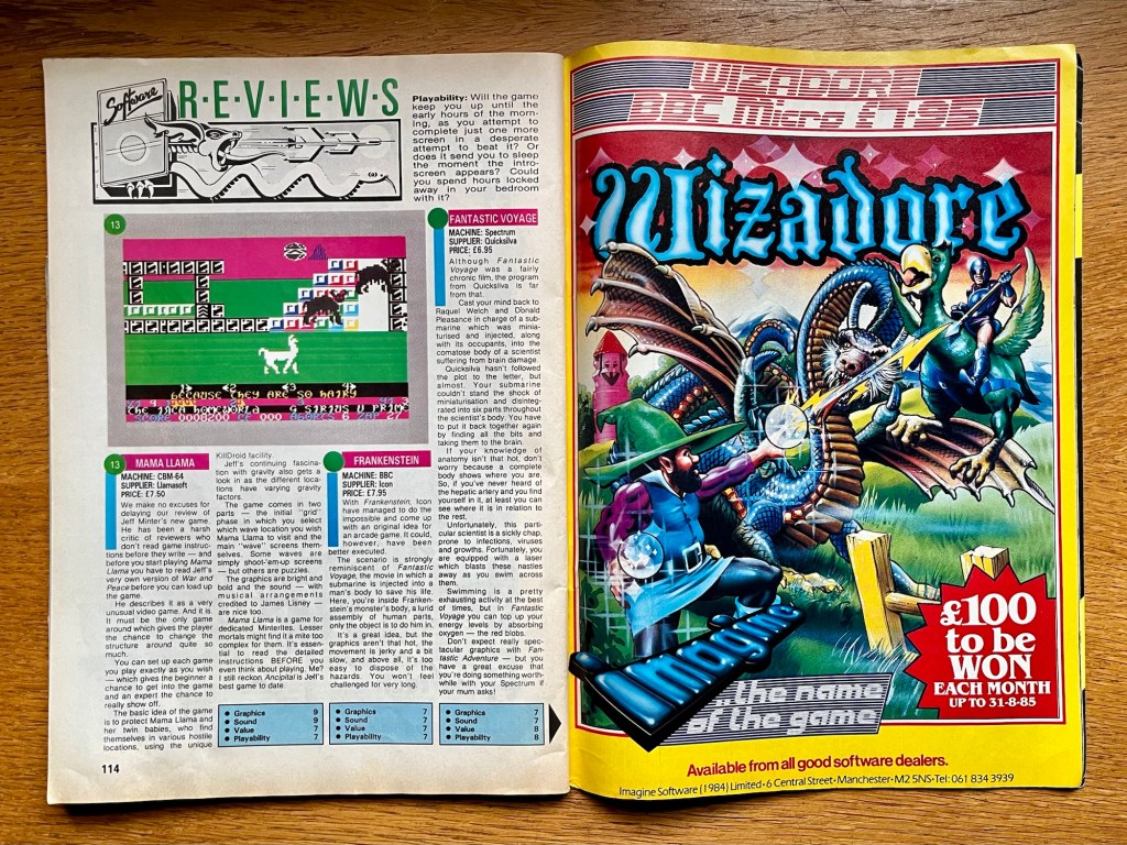Likewise, Jonah Barrington’s Squash back on the C64, which wasn’t just surprisingly fun but had some very cool software-generated speech in it too, and the very odd Give My Regards To Broad Street – featuring members of another well-known Liverpool band – also scores surprisingly highly! Nowhere near as high as Zaxxon on the MSX though, which would have been all perfect tens if it wasn’t for the outrageous £11.95 price tag! Excellent conversion of Buck Rogers on there too, while the best of the BBC this month is Caveman Capers, a really fun side-scrolling running and jumping thingy. The Commodore 16 got a decent set of arcade-type games in Berk’s Trilogy, but not a lot else (yet…) away the two 8-bit powerhouses this month, where I’ll finish by returning to the C64 for Jeff Minter’s latest bonkers puzzle-shooter-affair, Mama Llama, which wasn’t really his finest hour but is fun all the same, and Ultimate’s Entombed, also on there, which I still reckon is one of the best-looking games on the system, even if they’re not quite as enamoured with this as with previous higher-profile releases by the company. By the way, if you want some more best-looking, check out that glorious advert for Wizardore on the BBC across the page from the Mama Llama review pictured above!