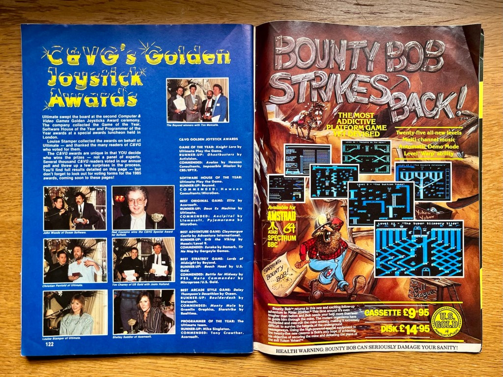 I’m going to run through a few of this issue’s other features now, and it’s good to see a few here after not a lot else to dig into over the past couple of months! The Golden Joystick Awards have taken place, so there’s a rundown of all the winners, with pics of some very eighties devs, including everyone at Ultimate, who somehow collectively won Programmer of the Year, as well as Software House of the Year, and their Knight Lore was Game of the Year. Elite was best original game (I assume in the absence of a Best Game Ever award!), then Daley Thompson’s Decathlon got Best Arcade-Style Game, Lords of Midnight got Best Strategy Game, and Claymorgue Castle was deemed Best Adventure Game. I’ll have to look that up because it’s not ringing any bells, but that’s what you get when you skip over the Adventure section here every month because you think it’s boring! I am going to do that again this month too because I just can’t face another six pages of nothing but nerd-text, but I will quickly mention the glowing review for Gremlins on the C64, Spectrum and Amstrad CPC, because it’s fully justified and to this day a favourite Christmas game of mine!