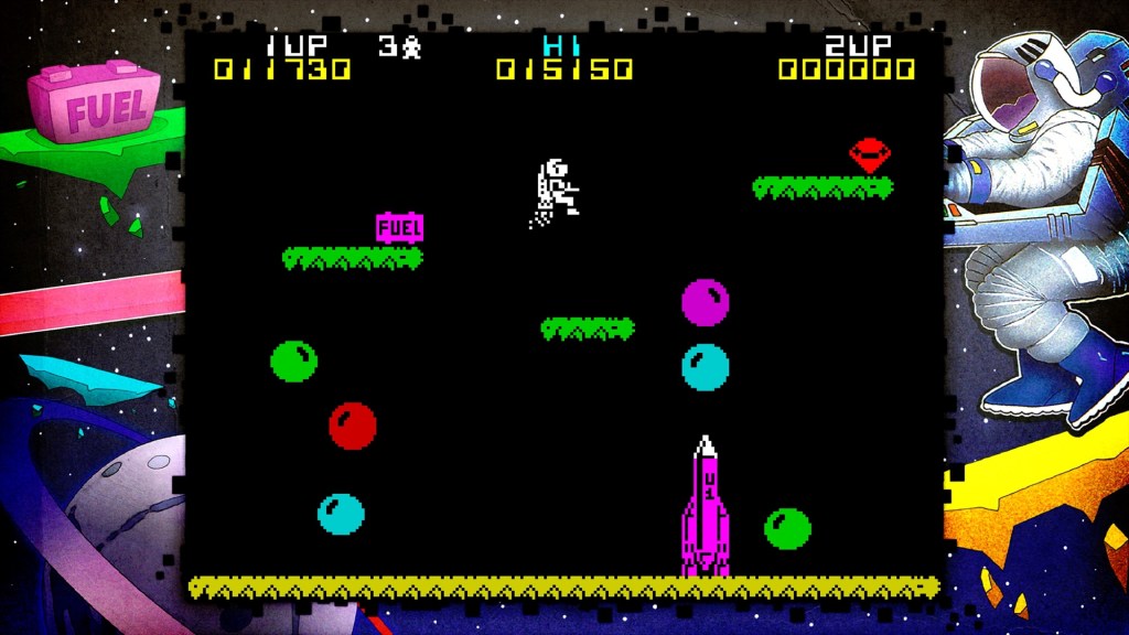 This pains me because two minutes ago what you’re looking at was another VIC-20 game, and where last time we had one of its great arcade conversions, this time was going to be a sheer miracle! And then I switched it back to the Spectrum version. Which is a cycle that’s been going on for days! Actually, (as backed-up by an early feature I did on it here) it’s a cycle that’s been going on since 1983, when it was first released on both platforms by Ultimate Play The Game (later Rare), and when my best friend had it on his Spectrum, while I’d get it a bit later on my VIC-20. And there’s really not a lot between them to play, but with the luxury of 16K of RAM on the Spectrum versus just 8K on the VIC (with an expansion pack!), you do get more variety of levels, and there were no compromises, such as not having an actual planet surface, which is why it’s here! You play as Jetman, though a bit like Mario’s first appearance in Donkey Kong, I don’t remember ever knowing him as Jetman until other games followed – he was just an astronaut with a jet-pack and a blaster who had crashed on a planet far, far away and had to rebuild his rocket from the bits strewn about the place, then fuel it up and start making his way home. All of this happens on a single wraparound screen, with three rocket parts that have to be dropped on top of each other in order, which you’ll find lying on the ground or on mid-air ledges, whilst fending off the planet’s fauna that randomly flies around the place impeding your quest. Once you’ve put the rocket back together, fuel starts dropping out of the sky, which you collect and drop onto your rocket until it’s full up, while also looking for falling jewels and other precious treasures for points. Then you head back into the rocket yourself, it takes off for the next planet, where you do it all over again in the fast of even crazier locals! I have to say, whichever version I was playing, these have always been a highlight – even more so than the new type of space ship you get every few screens – with so much variety, from shiny spheres to sinister geometries to bug-eyed fuzzy things that wouldn’t look out of place on The Muppets, and seeing what the next batch will be is as much a reason to want to play again as bettering your score! They’re ruthless too, but so is your laser fire, as it spreads out in huge pulses, one on top of the other, right across the screen as you alternate between walking and hovering, panicking and pointlessly trying to hide out, if only for the briefest respite while you work out the best route to where that fuel has just awkwardly dropped. Or worse still, when your rocket is all fuelled up and you’re on a platform across the screen with relentless waves of enemies between you and it! Jetman controls great though, with some inertia at play in the air, and the little flame effect from his jet-pack doesn’t hurt either! Then there’s explosions and more flames, and so much detail and colour everywhere, with the resulting colour-clash adding to the chaos rather than being an annoyance! Which is lucky when the sound effects are as shrill as these are! Jetpac is a masterclass in shooting everything everywhere, together with what’s become the inevitable bit on the side with this sub-genre, and the more the years go by, the more I reckon isn’t far off the likes of Bubble Bobble and Tetris if you’re talking perfect games!