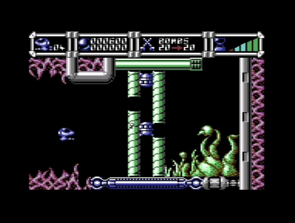 Yet another dilemma about which version to go for here, and I know it was a ZX Spectrum game first but that music on the Commodore 64 is some of the best on there… If only you didn’t have to make a choice between that or some really great sound effects instead! This is a multidirectional flip-screen shooter from 1988 with a hint of the platformer about it, as well as a load of different weapons to experiment with to get you through the diverse hazards you’ll come across, as you try to recover stolen booty from space pirates over three subterranean (I think!) levels you’ll never see the majority of… It’s proper old-school brutal! Some screens are straight-up fights against regular enemy ships you just need to get past to reach the exit, while others will have guns emplacements and homing missiles to find a safe route past, or there’ll be more alien defences to worry about, or tunnels to negotiate and moving hazards to precisely time your way through. Your choice of weapon, from regular missiles to bouncing bombs and heat-seekers, as well as a shield, is critical to each, and these sit on five number keys, and there’s also various power-ups, such as a rear-firing gun, to collect on top of all the jewels and stolen goodies, which you also need to collect enough of in the time allowed to successfully complete each level. Probably uniquely here, this is a very methodical game, requiring exploration of each screen, experimentation with weapons and positioning, and a far more puzzle-like approach than reflexes alone, although you’ll need those too. As well as those pixel-perfect movement skills you hopefully picked up from stuff like Manic Miner! Which I guess makes it not for everyone, but that sublime soundtrack certainly is, and it’s a real looker too, with a nice mix of boldly coloured, finely textured organic and mechanical scenery, brought to life by loads of those classic chunky Hewson particle effects. Worth the investment!