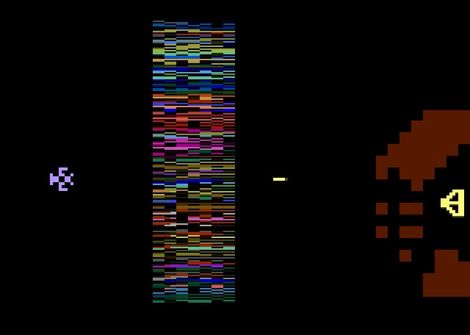 I’m not making apologies anymore but interestingly, the only two games I enjoy more than this one on the 2600 are also games that, like Yars’ Revenge, are very easy to be intimidated by… And until I wasn’t anymore, Seaquest was my favourite on there for many years! Released in 1983, it’s pretty much underwater Defender on a single screen – in fact, its creator at Activision, Steve Cartwright, has even referred to it as a reskin of that. As such, it’s another game that isn’t necessarily a natural fit here but I can’t think of a better place for it, and it really deserves a place somewhere… Wonder where Defender would have gone if I liked that as much! Doesn’t matter, in this game, we’re piloting a submarine, trying to rescue divers while shooting enemy submarines and, er, enemy sharks, and keeping an eye on the all-important oxygen supply. Fill up your sub with six divers, then you need to surface, where you’ll be given bonus points for any remaining oxygen, then moved to the next level to do it again but harder, with more enemies and bigger scores. You can fill up with oxygen whenever you need it too but you’ll lose a diver if you do (or lose a life if you don’t have one onboard), and this can make for some interesting high-scoring strategies if you’ve got lives to spare. Otherwise, gameplay is fast-paced and non-stop, as you dart up and down and left and right, getting in a shot and moving before a torpedo (or a big set of teeth) comes your way, as you also try to anticipate the ridiculously nonchalant movements of oncoming divers and any fish chasing after them. It’s unquestionably a brilliantly accessible, engaging and addictive formula, but the presentation here is what’s always appealed to me first – I’m a sucker for a gaming sunset, and Activision created some lovely ones on the 2600, with this particular gradient of oranges and reds emerging perfectly from the dynamic and imaginatively effective movement of the ocean surface below, before it drifts off into the darkness. Admittedly, a lot of the rest looks like a ten-year old drew it, but the subs and the fish and the divers are all as recognisable as they are colourful, which would be one way of describing the sound effects too! Defender on a single screen… Even better than the real thing!