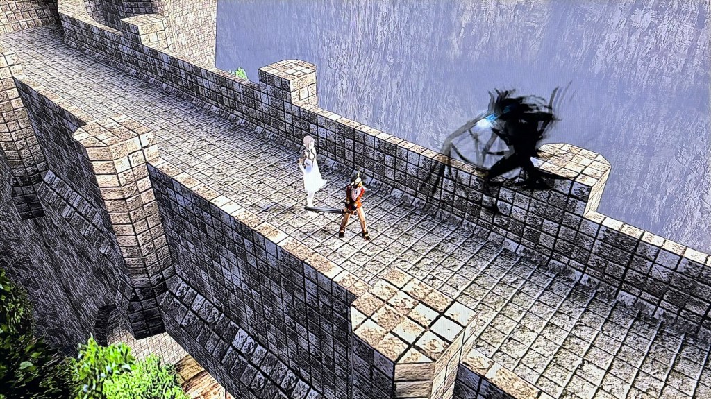 Late as I was to the party, I’ve now played the PlayStation 2 version of Ico enough times (and written a very deep-dive) to properly cement it in my top twenty games of all time. Only ever dabbled with the 2011 PS3 remaster though, so while I had a gap between big games before Silent Hill f arrived this week, it seemed like a nice way to fill it! Definitely was too, even if a bit of the magic was lost in all that polish… It’s still minimalist 3D action-platforming adventure with maximum immersion though, as “different” boy (called Ico) meets princess girl while they’re both locked up in a castle, which they then try to escape together, in the face of environmental obstacles, puzzles and her evil mother’s terrifying magical minions. Whether the PS2 original or here, the gameplay is sublime – simple and logical but, in combination with the deceptively intense narrative, it’s emotionally draining, frequently almost physically exhausting, and utterly wonderful all at once! Controls are certainly more fluid here, which most of the time does allow you to appreciate all of that a bit more too, although I think this can be at the expense of precision when required, especially for the more heavy-fingered like me! The huge boost in resolution and draw-distance further enhances the vertigo-inducing sense of scale of the original, as well as your sense of place, but this is where I think that magic I just mentioned takes the biggest hit, with the typically clinical PS3 graphical sheen constantly at odds with being uber-atmospheric. I’m not sure either soundtrack or sound effects are much different, but the latter especially did seem clearer. The only other thing that reallly stood out were the shadow-enemies being far more energetic and a bit more intelligent too, unlike your companion, unfortunately, who seems as slow on the uptake as she is off the mark! Did I enjoy every second regardless though? Yes! Even if it is without doubt going to be the PS2 version next time, although there’s plenty of New Game Plus features to be found, so we’ll see! By the way, sorry for the rubbish photo of my rubbish TV above – did my best!