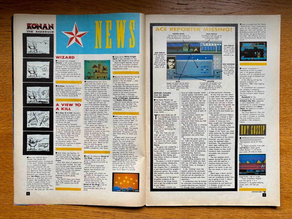 Right, news, or “News” as it’s now known – that’s right, the weird Hot Gossip column introduced a while back is gone and we’ve just got more regular news instead, which is all that was anyway! Glad someone else finally noticed though… That said, when second best James Bond movie ever A View to a Kill’s tie-in coming to Amstrad computers is one of your top stories, I’m not sure we’re in for anything too groundbreaking this month! The arrival of Zorro and The Goonies on everything is good news though, even if that is tempered when you realise the next story isn’t about an incoming conversion of Commando after all, but a rip-off of the arcade game called Who Dares Wins. Oh well, maybe one day we’ll get a port of the real thing! In the meantime, Commodore 64 owners could also look out for a new game called Paradroid by Hewson Consultants, apparently the “successor of Gribbly’s Day Out” rather than one of the machine’s all-time greats as it would later become known! But if Gribbly 2 isn’t your thing, how about more Jeff Minter with Batalyx, one of his most bonkers offerings yet! Aarrrggghhh! Just realised that particular piece of news is under a Hot Gossip banner so it hasn’t gone at all but is now making an equally bizarre reappearance! Nothing bizarre about Macadam Bumper, a new pinball game coming to the Spectrum and CPC though, or Ocean picking up the Rambo license, or a Geoff Capes game on the way, which I’m sure we reported on before, or maybe it was Brian Jacks, but whatever, that’s all the news for this month.