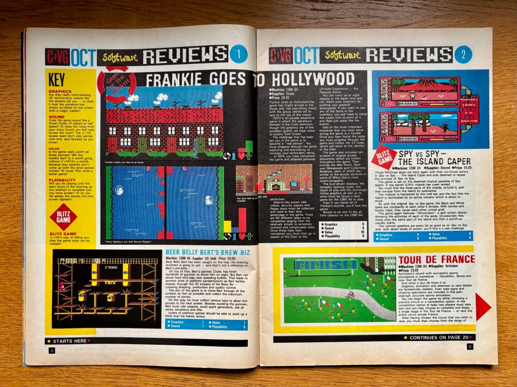 Reviews next, starting with one of the many standout memories I have of reading C&VG over the years, which this time involves a very colourful double-page featuring not only the game of my favourite band at the time, but Game of the Month too, awarded to Frankie Goes to Hollywood, plus another game that would go on to be a real favourite a couple of years later, Spy vs Spy – The Island Caper, and Tour de France, and Beer Belly Bert’s Brew Wiz, which really deserved more recognition than it ever got, despite the decidedly average scores here! Nothing average about FGTH though, which had you plodding around a typical working-class housing estate completing tasks and mini-games to become a “real person.” Totally mad but a real pioneer too, as well as a real looker! Spy vs Spy scored almost as highly, and to this day – together with its predecessor and sequel – is one of the great couch multiplayer experiences, as you try to out-slapstick the opposing spy! I reckon Tour de France is one of the best interpretations of the bike race to this day as well. There’s way too much other stuff reviewed in this issue to get into everything, so I’m going to attempt to pick a few highlights, as tempting as it is to go all-out! I do want to give a special mention to a bunch of stuff away from the usual C64, Spectrum and CPC suspects though, which has become unusual in these heady times…