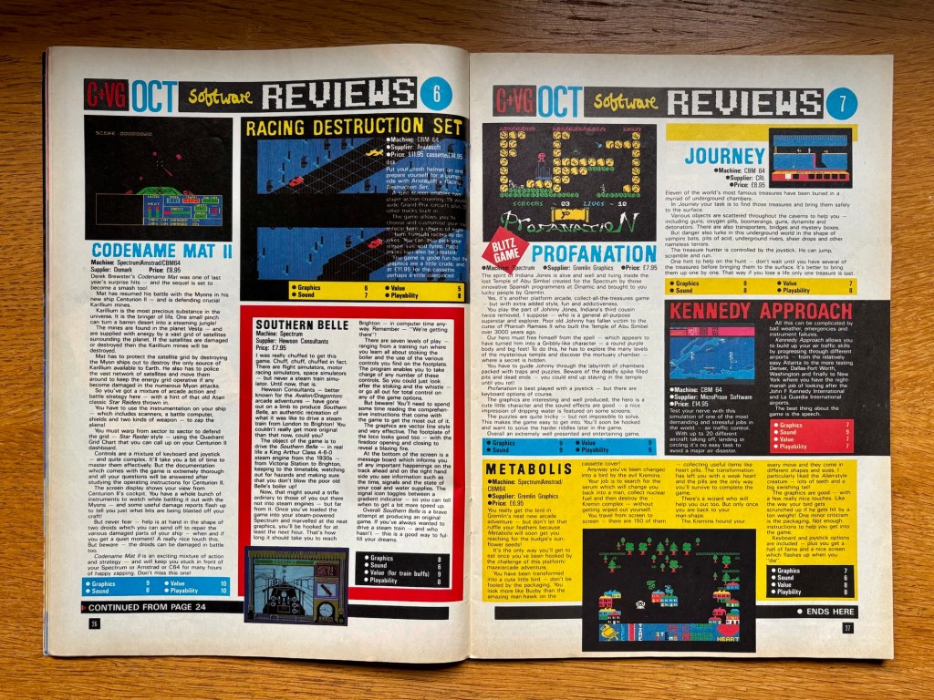 We’ve got Aabatron, April Showers and (fittingly perhaps) One Last Game on the BBC; and Hijack and Bio-Defence on Atari 8-bit; and even Robin Hood on Dragon 32, would you believe! Unfortunately, all mostly very average at best, but beggars can’t be choosers at this point, although if you’re one of the handful that had a QL, there’s a very high-scoring take on Pole Position on there, so make the most of that too! A couple of classic simulations on the Spectrum next, and unusual ones in their own way at that, with Dambusters having you reenact the mind-blowing World War II bomber attack of the same name, while Southern Belle takes you on a more sedate journey from London to Brighton in a steam train, and of everything here this month, this is my own personal highlight! Only one Blitz Game award this issue, awarded to Profanation on the Spectrum, a really cool Indiana Jones-ish puzzle platformer, but Codename Mat II across the page actually scores higher, with perfect scores for value and playability, and is as good a take on Star Raiders that ever existed outside of an Atari machine! I’ll finish with a quick mention of Kennedy Approach on C64, an air traffic control sim that I’ve always liked the look of but to this day haven’t played – look out for that getting fixed in an upcoming Weekly Spotlight feature very shortly. Says it’s got speech here too so can’t wait to hear that!