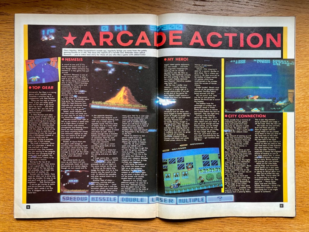 At this point I’ve got a confession to make… We’re supposed to look at a Games Book next, and a bunch of type-in listings, but over the course of the past forty years it’s disappeared unfortunately, so I’ll just let you know it would have contained a betting game called Day at the Races for Atari 8-bit, then Moon Buggy and Manic Pacman on the Spectrum, and Asteroid Lander on CPC, and you can probably guess what all three of those involve. Love how blatant they are with these things now though! Anyway, shame I lost that and not the Adventure section instead, which, as usual, is pages and pages of nothing but nerd words, but what’s this? Looks like a saucy seventies seaside postcard – it’s a review of Terrormolinos, which is actually a really decent game, even if it’s no Super Gran, also reviewed across the page! The very welcome return of double-page, full-colour Arcade Action next, dominated by the kind of black magic I loved this feature for every month with Konami’s horizontally-scrolling shoot ‘em up classic, Nemesis! I love seeing first appearances of stuff like this again almost as much nowadays too! We’ve also got twitchy racer Top Gear, Sega’s cartoon beat ‘em up My Hero (or possibly Love Passion according to the text) and Jaleco’s excellent colour the platforms driving-platformer City Connection. What a time to be alive!