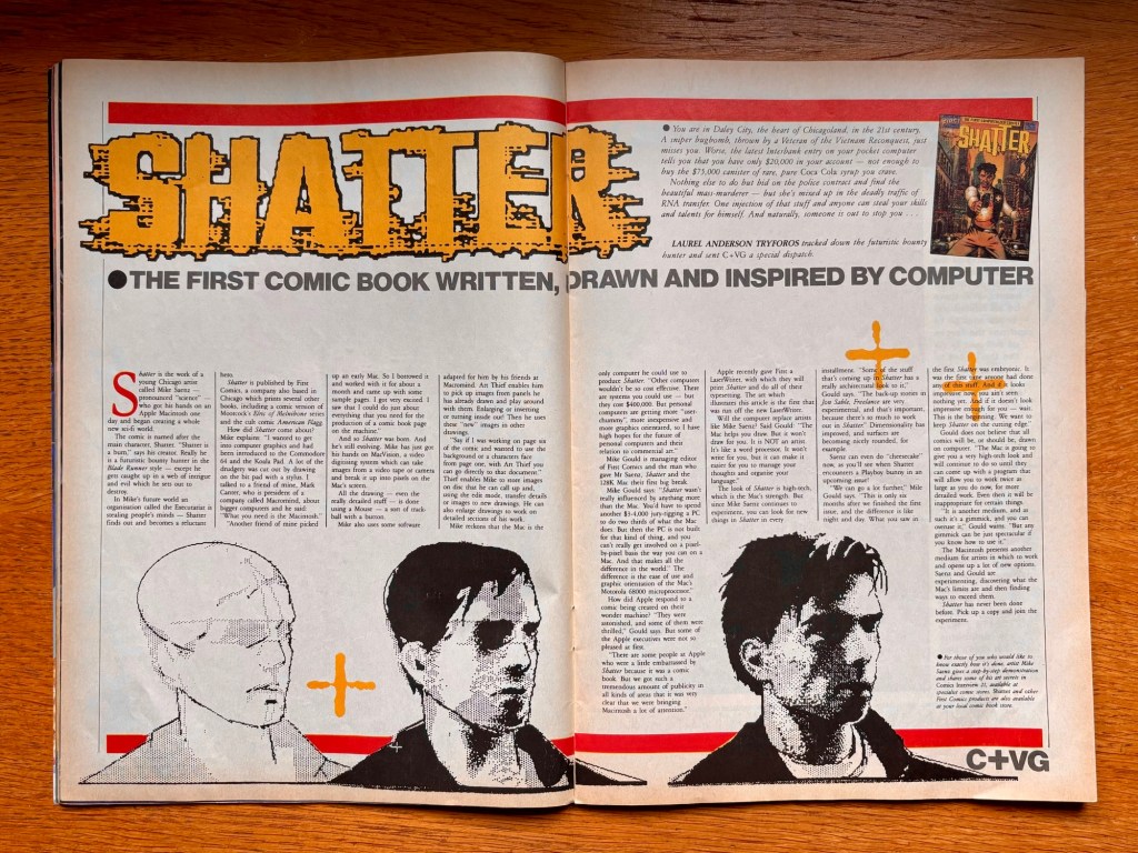 A quick look at some of this month’s other features now, starting with a fascinating piece about a new comic called Shatter, a Blade Runner kind of thing all created on a computer, which, believe it or not, seems to be a first! “All the drawing – even the really detailed stuff – is done using a Mouse – a sort of track-ball with a button.” It was all done on a Mac, and whether or not it really was a first, it seems to be quite the pioneer all the same! There’s also an interview with the bloke behind the Lord of the Rings game on the cover, so I won’t get too much into that again, but I was interested to hear about his problems interpreting The Fellowship of the Ring for a game because “not a lot happens” in there, which I guess is true in that context! Not much else going on aside from regular features like The Bug Hunters comic strip, which if I remember right was pretty long-running and is a meaty three pages of proper 2000AD-style sci-fi stuff, and there’s all the usual cheats and tips and advice, which I usually skip over, but some pokes for Airwolf on the C64 did grab my attention this time, especially the fly through walls one (POKE 5026,252 if you’re interested) which I reckon will increase enjoyment of one of the most brutally difficult games ever created no end!