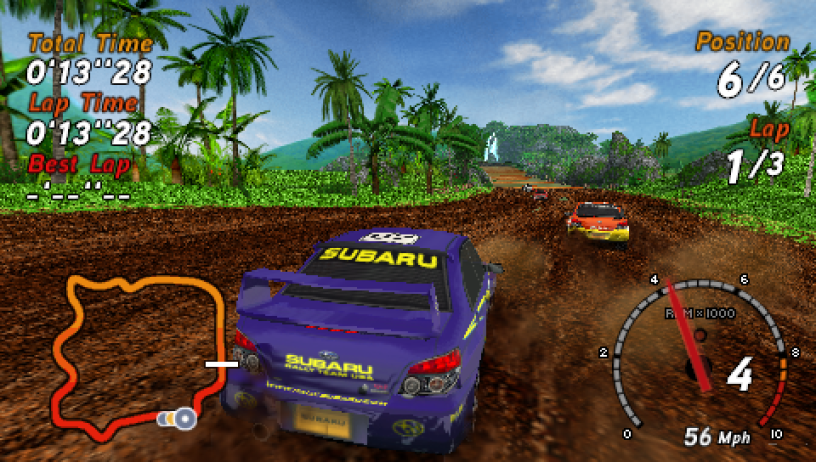 I think I’ve saved what I spent the most time with this week until last, and it’s a 2007 title I actually bought a few months back known as both Sega Rally and Sega Rally Revo… Got a semi-decent photo of this one too! It was officially the fourth in the series, but is based on the Sega Rally 3 arcade game, which it was developed alongside by BugBear for this version, rather than Sega Racing Studio themselves. It’s the classic fast and loose Sega Rally arcade formula all the same, with you racing through fifteen different tracks set in jungles, snowy mountains, frozen tundras, rocky canyons and tropical beaches. Like everything we’ve seen today, there are a bunch of modes too, with quick races, time attacks and various multiplayer events, although once again, good luck with those! The headline Championship Mode is going to keep you busy for ages though, where you start out in the Premier Championship, but achieving certain criteria will unlock Modified and Masters classes, and they all consist of Amateur, Professional and Expert leagues to progress through, which will then unlock all sorts of other goodies as you go. These include loads of cars, with 2WD, 4WD and some Sega classics, and they’ve all got various customisations to apply if you want, but it’s no Colin McRae in any respect, so just jumping into the action is fine, and there’s plenty of that on offer too! Races are against five other cars, and occasionally questionable AI aside, are a proper high-speed thrill ride once you’ve got a feel for driving with the lovely analog nub, with really nice “rally” handling across the different terrains, which deform as you go around and take lumps out of them, although it’s more gimmick than game-changer. There’s tons of mud and dust and snow and debris flying about too, and things to break, and lovely little touches like occasional camera flashes as you pass groups of spectators, or public transport passing by, and everything generally looks absolutely gorgeous and full of colour and life, as your easy-going co-driver provides directions, the engine roars, and some fine but generic music plays along in the background. I’m not sure anything will ever come close to the original Sega Rally for me but this is as good as you could ever have hoped for on the go on a PSP!