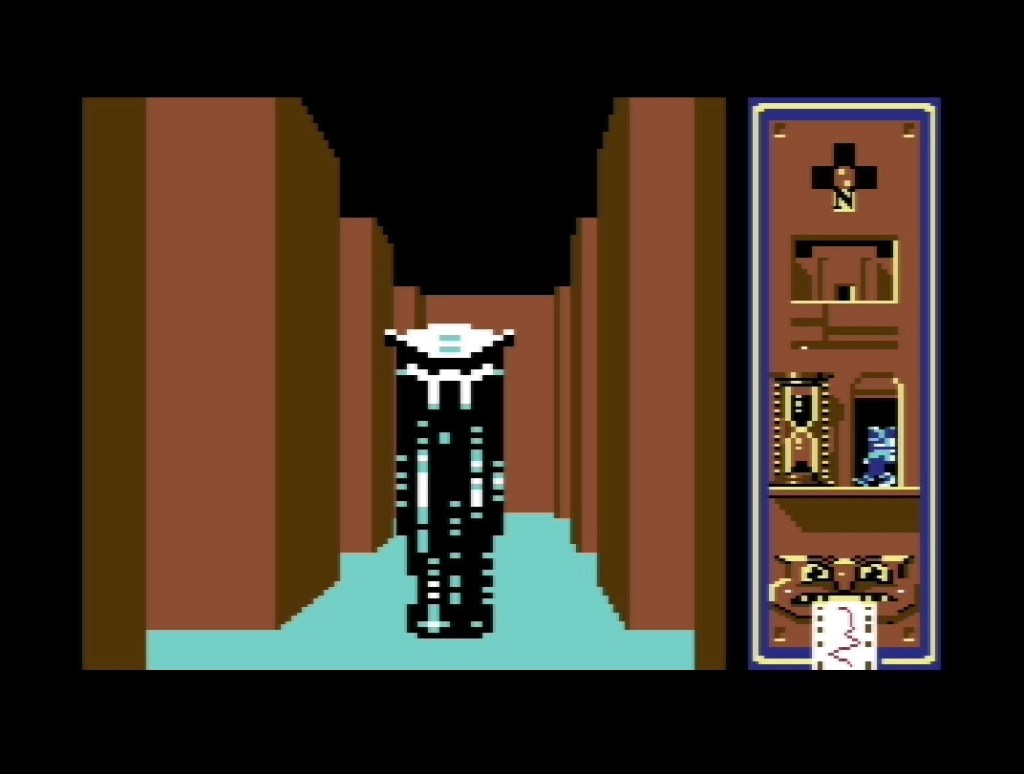 Scarabaeus is one of those games that could only ever have existed on the Commodore 64 in 1985! It’s a bonkers mix of 3D maze and “proper” puzzles, spread over three floors of an Egyptian tomb, which you’ve arrived at in your spaceship in search of the titular treasure, as well as an antidote to the spider bite you got on the way in! The first level involves chasing a mummy (apparently!) around an impressively fast-moving and super-smooth maze, with walls that appear and disappear to cleverly mix it up, and every time you catch the mummy, you’ll be rewarded with a hieroglyph, which will gradually populate a 3×3 grid you’ll need on the next floor. We’ll stick with this floor for a sec though because that’s what we’re looking at here, and even if it doesn’t look like a mummy, I reckon these things are the best-looking meanies on the system! And doesn’t that typically brown maze set them off perfectly, looking like blocky 8-bit Predator prototypes, all menacing in mostly black but using grey and white highlights to provide all the terrifying personality you could ever wish for! Once you’re done staring, that next floor is accessed via an elevator on a winch you wind up and down, but really wasn’t designed for modern d-pads because miss a single direction press as you rotate and you’ll crash to your death! This becomes more of a problem after the very lengthy game of cat and mouse on the next floor, where you first need to lure deadly spiders out of the alcoves, in which you then need to use those hieroglyphs in a kind of graphical wordsearch puzzle, once you’ve led them far enough away so you can run back and do it in peace! Successfully solving each of the thirteen puzzles here will further reward you with a zombie trap and / or a potion, which you’ll collect in the corresponding location on the final floor (where you’ll also need those zombie traps). One of the alcoves also contains a key to unlock that floor, which you get by solving a different and nicely complex block-sliding puzzle. On the third floor, you can now collect those potions but beware of some that aren’t so good for you, as well as those zombies running around trying to drain what’s left of your health! The potions will boost it though, and also reveal a bit more of the final puzzle, involving lining-up symbols in the right order, which then opens the pharaoh’s burial chamber and the treasure. It can be a cruel game but it’s also incredibly rewarding, with a nice mix of puzzles (assuming you’ve been paying careful attention and also read the instructions), some very intuitive maze-action and a great level of tension and atmosphere. Nice learning curve too, and you’ll want to keep coming back to chip away a bit further! And yes, it’s very C64 in 1985 to look at and listen to as well as play but I wouldn’t have it any other way, and those gorgeous meanies running around are worth the asking price alone!