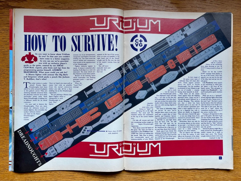 We’ll have a look at what’s on the cover first though, and this month we’ve got a lovely example of some very eighties sci-fi art, which looks a bit airbrushed with loads of 3D motion and gradients and glowing stuff, all leaping out of the depths of space to welcome the “How to Survive Uridium Combat Guide” inside! It’s straight from the horse’s mouth too, none other than the legendary Andrew Braybrook (who’s also a very nice man), with this big diagonal overlay showing the layouts of all the Dreadnoughts you need to take down to beat this incredible super-fast shooter that still screams Commodore 64 to this day, although my ZX Spectrum version wasn’t bad either! “NEVER try to fight them from the front” is very good advice when it comes to the defence forces, and there’s a lot more besides, although I’ll always stink at this whatever anyone says! Also a chance to win a copy of the game, together with the rest of Hewson’s awesome catalog for your choice of Spectrum, C64 or Amstrad CPC, in return for your own fiendish Dreadnought battlecruiser design, as if what’s there isn’t hard enough already!