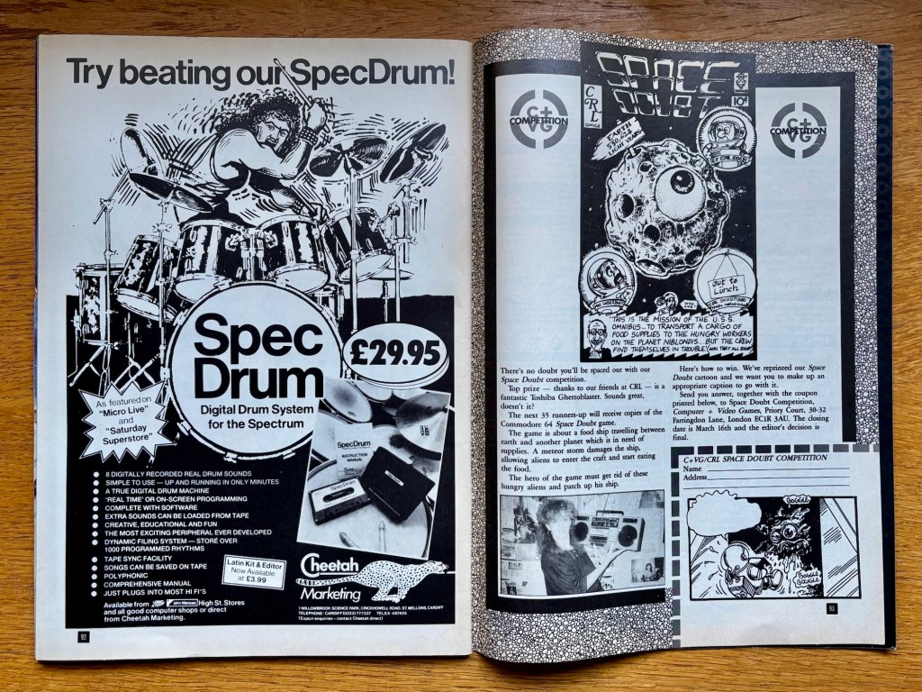 Other competitions this month include a Spectrum 128 up for grabs care of Rainbow Software and their Art Studio graphics package, which I always thought looked really cool but would be totally wasted on me! And I’ve taken the liberty of dragging this section out a bit so I can also share the picture above showing the other big competition here, where you can win a Toshiba ghettoblaster, and that comes from CRL and their new Space Doubt game, which I’m sure was about shooting aliens and keeping your ship stocked up with food or something, so no idea where winning this iconic piece of 1986 fits into the plot! Big poster included for it too though, and for once that didn’t end up on my bedroom wall because it’s still right there in the middle pages! Anyway, the real reason I wanted to share this picture wasn’t really that at all, but the wonder that was the SpecDrum advertised across the page, which I’m unlikely to ever get an excuse to share again! As featured on Micro Live and Saturday Superstore (mmm, Sarah Greene), this £29.95 “Digital Drum System for the Spectrum” gives you eight digitally recorded real drum sounds that you can play real-time or program, and it’s “the most exciting peripheral ever developed” to boot!