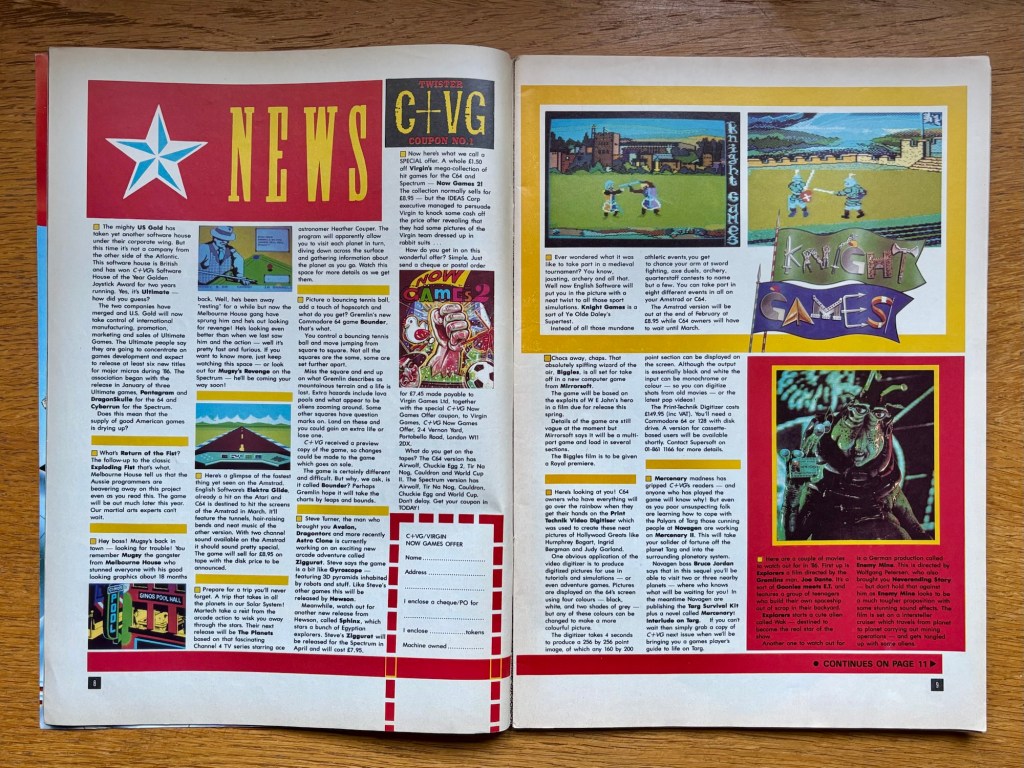 Upon opening the News section this month, my eye was immediately drawn across the page to the mini-preview of Knight Games, coming to Amstrad and C64 almost imminently. I always thought this looked great, although the washed-out screenshots here don’t really do it justice, and at the time I probably saw it as some kind of follow-up to my recently released new favourite, Winter Games, which it wasn’t. Amazingly though, to this day, I’ve still never played the thing, so I can’t really tell you what it was either! The Amstrad’s also getting its own version of excellent sci-fi racer Elektra Glide, which we’ve previously seen on Atari 8-bit and C64, and there’s a teeny snippet on Return of the Fist, which would soon evolve into the upcoming sequel to that excellent fighter from a few months back, The Way of the Exploding Fist by Melbourne House, who’ve also got the very good-looking Mugsy’s Revenge coming soon to the Spectrum. U.S. Gold have apparently snapped-up Ultimate, and will immediately team-up with them on the release of Pentagram and DragonSkulls on Commodore 64, as well as Cyberrun on the Spectrum, none of which were particularly high-points of their catalog in my humble opinion, so hopefully there’s more to come…
