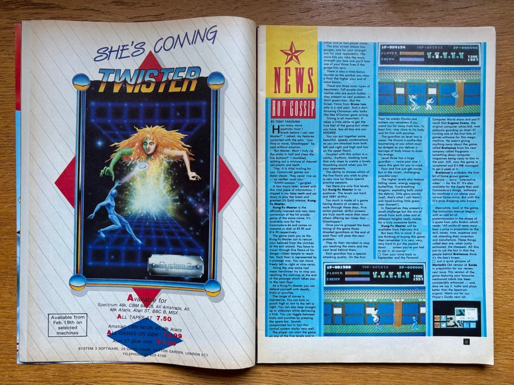 We’ve got another return of the weird and sporadic Hot Gossip extension to the News section this issue, which mostly covers the new conversion of Kung-Fu Master on the C64, also from U.S. Gold. Thankfully not a sniff of the dreadful Spectrum port, which to this day remains the most disappointing game I’ve ever spent what little pocket money I used to get on! What’s really interesting here is a little side-piece on a game I honestly don’t remember called Brataccus though, on the way from a new company called Psygnosis, but as significant as that is in its own right, what got my attention was some very early chatter about the 16-bit machines it’s being developed for. We have come across them a couple of times individually in previous Retro Rewind features, albeit in a surprisingly understated way, given their near-future dominance of the market, but this is where we are currently, with what is the first game I recall being specifically built with them in mind… “Brataccus is probably the first bit of home grown games software – sorry, “interactive video” – for the [Atari] ST. It’s also available for the Apple Mac and Commodore Amiga. Software for machines a cut above your normal home micro. But with the ST’s price dropping who knows…” Watch this space, I reckon!