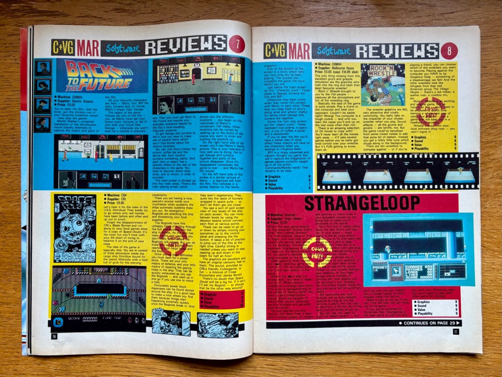 Speaking of dreadful screenshots, I’m not sure a black and white screenshot from the inferior Spectrum version of Winter Games is exactly showcasing it in the best light, but here it is going head-to-head with Winter Sports, which did have the benefit of more to do, including straight-up skiing events, but nothing else ever came close to the polished majesty of that beautiful game, especially its C64 version! The seminal Back to School on the Spectrum (follow-up to the even more so Skooldaze) amazingly scores lower than both toy tie-in Zoids and budget-looker Rasputin, also reviewed nearby on there, and none of which are anywhere near as just above average as suggested. Someone having a bad day, I guess – maybe they’d just done the terrible Doctor Who and the Mines of Terror on the BBC too, although it’s nice to see it hanging on in there, especially with the classic Repton 2 covered this month as well (and you can see my deep-dive on its third iteration on there here). Then we have C&VG Hit awards for sprawling sci-fi adventure Strangeloop on CPC, one of the all-time great wrestling games, Rock ‘n Wrestle, on C64, and that Space Doubt on there from earlier, which wasn’t the game I had in mind but the comment about the relevance of ghettoblasters still stands! I’m not into Back to the Future but that finally does alright for itself after months of hype too, and I know I’m going long but I also want to mention Master of Magic, an outstanding dungeon-crawling budget adventure for the C64 from Mastertronic, which I’d argue is one of the all-time great budget titles on any system!