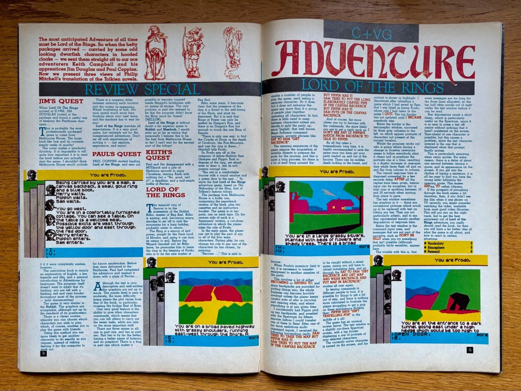 Oh no! It’s already the stuffy old Adventure section again, although this month we do have a Review Special to look forward to, and the headline act there is Melbourne House’s Lord of the Rings on the Spectrum, although I’m not sure the platform it’s on is ever actually mentioned in the typical mass of words that comes with anything in this bit, but just look at those screenshots in case you’re in any doubt! I did notice they said the graphics weren’t up to the standards of its relatively ancient predecessor, The Hobbit, and that’s an understatement, as well as no doubt a lot of the reason why no one ever remembers this while the first game is legendary… Amazing how much atmosphere a few garish stills can generate when done right! This one also only followed the first of the three books in the trilogy, The Fellowship of the Ring, and while I’m open to being proven wrong in future issues, I don’t think we ever got any more. Which is a shame because despite the rubbish graphics, this was decent and did some interesting things with the genre. I’m not going to get into the other games reviewed but this really annoys me… There’s a special scoring system for this section, involving Vocabulary, Atmosphere and Personal, and yeah, it’s ridiculous, but of the other games reviewed in this Reviews Special, only three use it, while five or six more use a “Personal Rating” only, and a further two have no scores at all. Ridiculous or not, just be consistent!