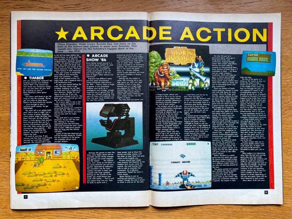 What’s always consistent is how mind-blowing the Arcade Action section was every month, and I’m not sure it ever got more mind-blowing than our very first glimpses at Sega’s “venture into hydraulics” with the legendary Space Harrier, the star of the recent Amusement Trades Exhibition International show! “You play a dragon-buster whose sole purpose in life is to run and fly through as many object strewn screens as possible, defeating a fabulously colourful dragon at the end of each section.” Near enough! Wow, still blows me away that we were seeing stuff like this for the first time! Interestingly though, they seem more taken by Bally Sente’s Strike Avenger, which also came in a fancy climb-on cabinet, and was some kind of submarine shooter thing according to this, although I don’t know it at all, and they only really talk about the cockpit you get in to play it! Elsewhere, some game called Super Mario Bros. by some Japanese outfit called Nintendo “should be a great success” and there’s also a mention of Turbo Sub, which I only mention again here because as I write, I’ve just done a deep-dive on the Atari Lynx port-meets-reimagining (here), where it isn’t only just a fantastic on-rails shooter in its own right, but might be the best example of a conversion done better than an arcade original ever! Anyway, that more or less disappeared after this and was pretty much the end of Entertainment Sciences who made it. Oh yeah, there’s also a nice feature on Timber, Bally/Midway’s really hidden gem of an arcade-lumberjacker!