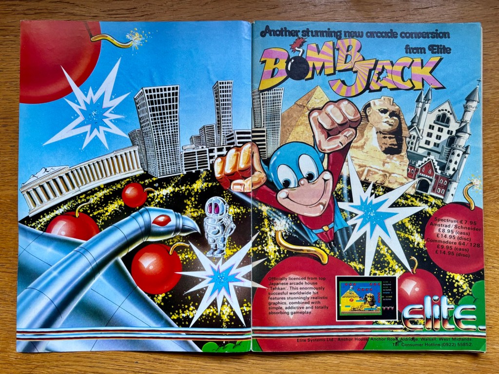 At less than a hundred pages, this issue was a relatively slimline one, and as such didn’t have that much else going on. Well, apart from the Book of Games, which, unlike the Space Doubt poster, didn’t survive being removed from the magazine’s original middle pages! I’m sure I had a good time typing-in whatever BASIC classics were included in it though! There is what’s almost an advertorial for Elite (the company not the game), with a £2 money-off voucher for their upcoming Bomb Jack conversion for the Commodore 64, ZX Spectrum and Amstrad CPC, as well as a nice teaser for the Ghosts ‘n Goblins port that’s also on the way, and a less nice tease rather than teaser for the greatest game we never got, Scooby Doo in the Castle of Mystery “which will be released in April.” Yeah right! I’m not getting started again on that though (but you can read more here), so let’s jump to a look at new and notable adverts that increasingly make up the bulk of however many pages we get each month, and we’ll stick with Bomb Jack, which you can see above and I reckon is one of the all-time great video game adverts. Elite really nailed capturing not just the essence of their games around this time, but also what was virtually a walkthrough, as can be see for this one above!