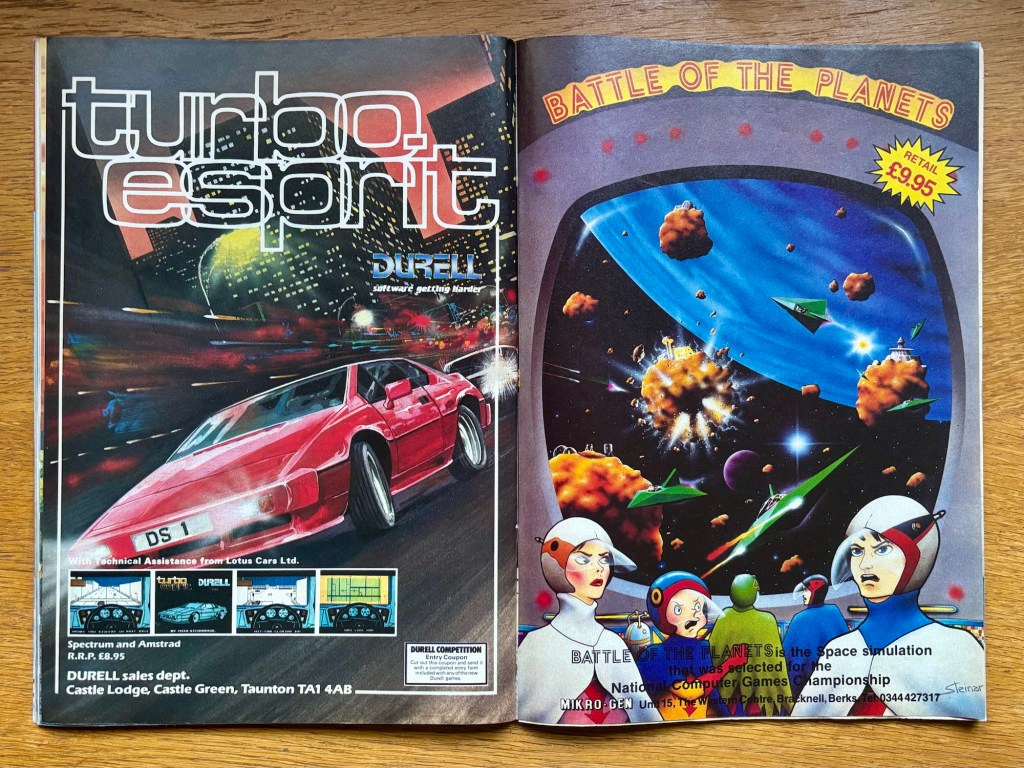 I skipped over Battle of the Planets earlier but somehow the advert survived my bedroom wall (for this month at least), but maybe more notable is what you can see across the page in the picture above, which is Durell’s frankly miraculous Turbo Esprit! We already came across Back to School and Skooldaze earlier, and together with this, you have the very genesis of the Grand Theft Auto franchise, all wrapped up in this very issue! Good advert too – fancy car, wild screenshots… I was 100% sold! Uridium is also making another appearance, where we can see exactly where that cover image this month came from, while Elektra Glide is entirely making in-game action its focus in a new version of its ad from English Software, and there’s Max Headroom too, which also ended-up on my bedroom wall at some point in a later issue! Ocean are back with more Hunchback, this time Hunchback The Adventure, although there’s always room for the creaking originals they’ve now been relentlessly touting for years as well, then it’s mostly other stuff we’ve seen before, as cool as the adverts for stuff like Zoids, Gunfright and Super Bowl are! I’ve tried to cram in a few other examples as we’ve gone here, including the delicious advert for V, also from Ocean, but as always, these things rarely appear only once, so hopefully we can cover anything we’ve missed another time. And that sounds like a good place to call it a day this time, so I hope you’ve enjoyed our look at the magazine together, and I also hope to see you again in a few weeks when April 1986 comes around!
