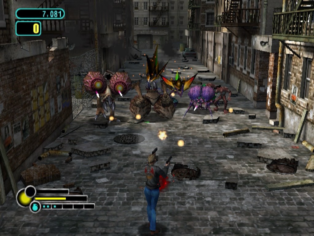 After all that, maybe I was worrying about nothing… If only everything here was Space Invaders from a different perspective! This really is that too, released by Taito in 2004 to mark the 25th anniversary of the game that started everything we’re looking at! You’d be forgiven for not knowing any of that from the screenshot here though, where ground-to-air combat has seemingly been replaced by this sleazy post-apocalyptic urban shootout! The gameplay is very familiar though, as is the surprisingly fleshed-out narrative, played-out through cinematic cutscenes between levels, and involving a full-on alien invasion of Earth by these nasty (and ultimately very gooey!) insectoid things in their flying saucers! Humanity’s last hope lies in your choice of three playable survivors, made up of a desperate woman searching for her missing fiancée, a cop out for vengeance after his squad was wiped out, and a kid who had a similar experience when all his friends were slaughtered in front of him. Whoever you go for, you’re in for wave after wave of invaders that are maybe more Galaxian than Space Invaders in their tactics, quickly getting right in your face, while others will hang back to spew all kinds of bullets, and as fast as you kill them, more keep coming! Speaking of Galaxian, some of them have a properly terrifying shriek too, which does make up for a pretty generic orchestral soundtrack, while visually it’s kind of Mars Attacks in various war-torn backstreets. They’re atmospheric and with a nice sense of perspective though, and make an ideal backdrop for a fast-paced but otherwise surprisingly authentic (for better or worse in 2004) take on the granddaddy of them all!