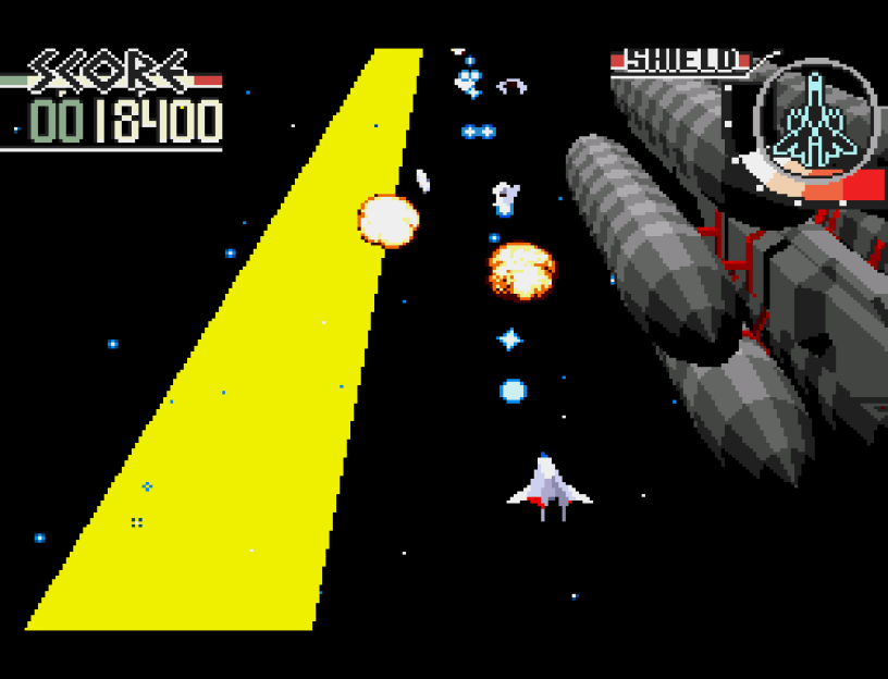 This is another game I’d never played until relatively recently, although given the platform it was originally released on, it’s hardly a surprise! The Sega Mega Drive Mini 2 was where I first encountered it back at the end of 2022, when it was one of a dozen Mega-CD (or Sega-CD) games included. Turned out to be quite the springboard into discovering its wider library too, including what have become several real favourites, as well as an obsession with Sonic the Hedgehog and completing everyone one of his 2D adventures (more in another top ten covering those here)! As for Silpheed, this was love at first sight, and today is generally the reason I fire up that Mini again. While it’s very much vertically scrolling shooter in spirit, like Xevious just now, it’s been tilted to a 3D perspective, but in this case, its original incarnation on the obscure NEC PC-8801 computer all the way back in 1986 also pulled-off an impressive pseudo-3D approach, as well as the use of 3D polygons. The Mega-CD port came in 1993, adding these stunning pre-rendered video backgrounds, together with some excellent polygonal-anime cutscenes, relentless in-game talking and some very high energy electro-synth-rock music. It’s high energy everywhere you look though, with light and colour and special effects all over the place – there’s just so much spectacle and so many memorable, large-scale set-pieces; in fact, you can see one progressing in the screenshot at the top of the page and the one just above, and if I’d added a third, there’d be this huge, screen-filling particle-effect explosion to admire too! It does all disguise a wafer-thin plot though – something nonsense about galactic terrorism – and the gameplay itself is pretty generic, and the feel of it had fundamentally already been perfected a decade or so earlier in the next game we’ll look at… Some good power-ups and scoring stuff to grab though, and there’s also a pretty unique repair pick-up system that creates some really tense moments, as you constantly and inevitably approach death when things quickly start to get frantic from the second of the eleven levels onwards! It’s an exhilarating ride all the way though, and as wonderfully in-your-face as any game here!