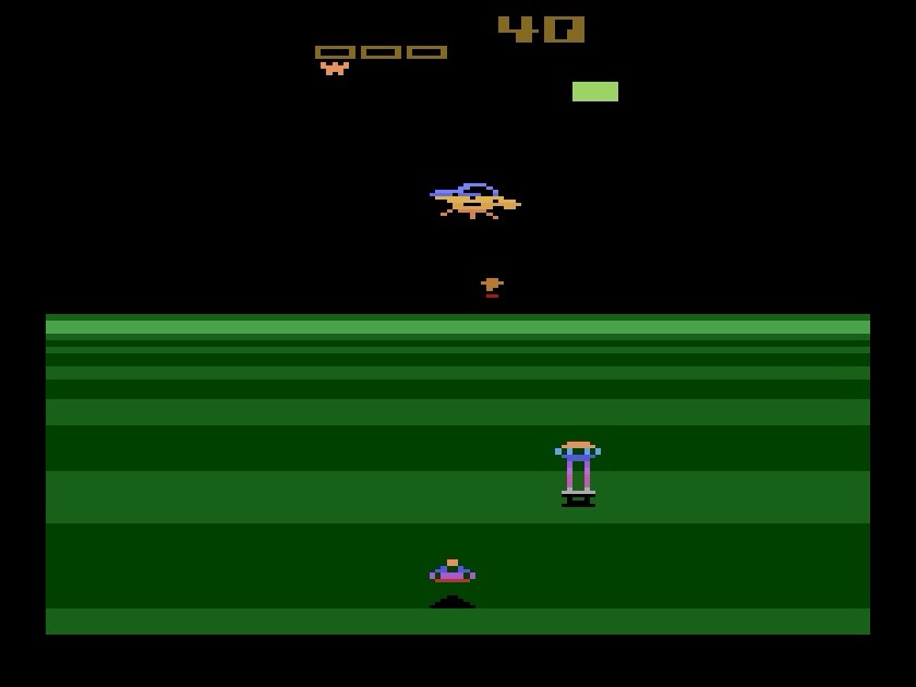 Our next game might not be one of Activision’s best-known Atari 2600 titles, but if you want super-smooth 3D motion on there then you won’t get much better, although if you’re one of those sensitive to flashing-types, then you probably won’t get much worse either! Fortunately, no one was that sensitive about all kinds of things when this came out back in 1984, and visual tricks like that every time you shoot an alien, combined with some really meaty sound effects, really elevate the immersion. Plenty of action to keep you on your toes too, as you patrol the Earth’s Restrictor Shield, which seems to have backfired because the pesky aliens are now travelling across its protective beams to attack you! You need to clear a certain number of them from each sector before facing-off against a bigger and more aggressive mothership, taking it down with one of your limited special missiles before it crosses the play area for big bonus points, then moving on to the next one. The gameplay itself doesn’t shy away from its influences, with increasingly erratic aliens and new types of danger being introduced as you progress, and things soon get very frantic (not to mention “flashy”), especially when you start messing with the various difficulty settings! And that 3D effect is so impressive for the time, even if does serve to mask some otherwise simplistic (for the time!) visuals. Simplistic never hurt though, and this is living proof of that!